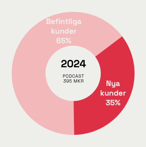 I årets rapport tittar man för första gången på hur fördelningen ser ut mellan befintliga och nya kunder. Här framgår att 65 % av investeringarna utgörs av befintliga kunder. I snitt investerade befintliga kunder 39 % mer i podcast 2024 än året innan.