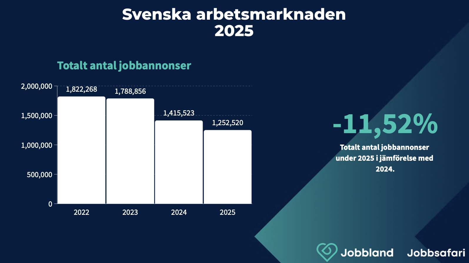 Under 2025 minskade antalet publicerade svenska jobbannonser med 11,5 procent. Trots en tydligt negativ utveckling är tappet en knapp tredjedel så stort som under 2024. “Det är välfärdens behov som håller systemet från att tippa över” säger Anita Rae, arbetsmarknadschef på Jobbland och Jobbsafari.