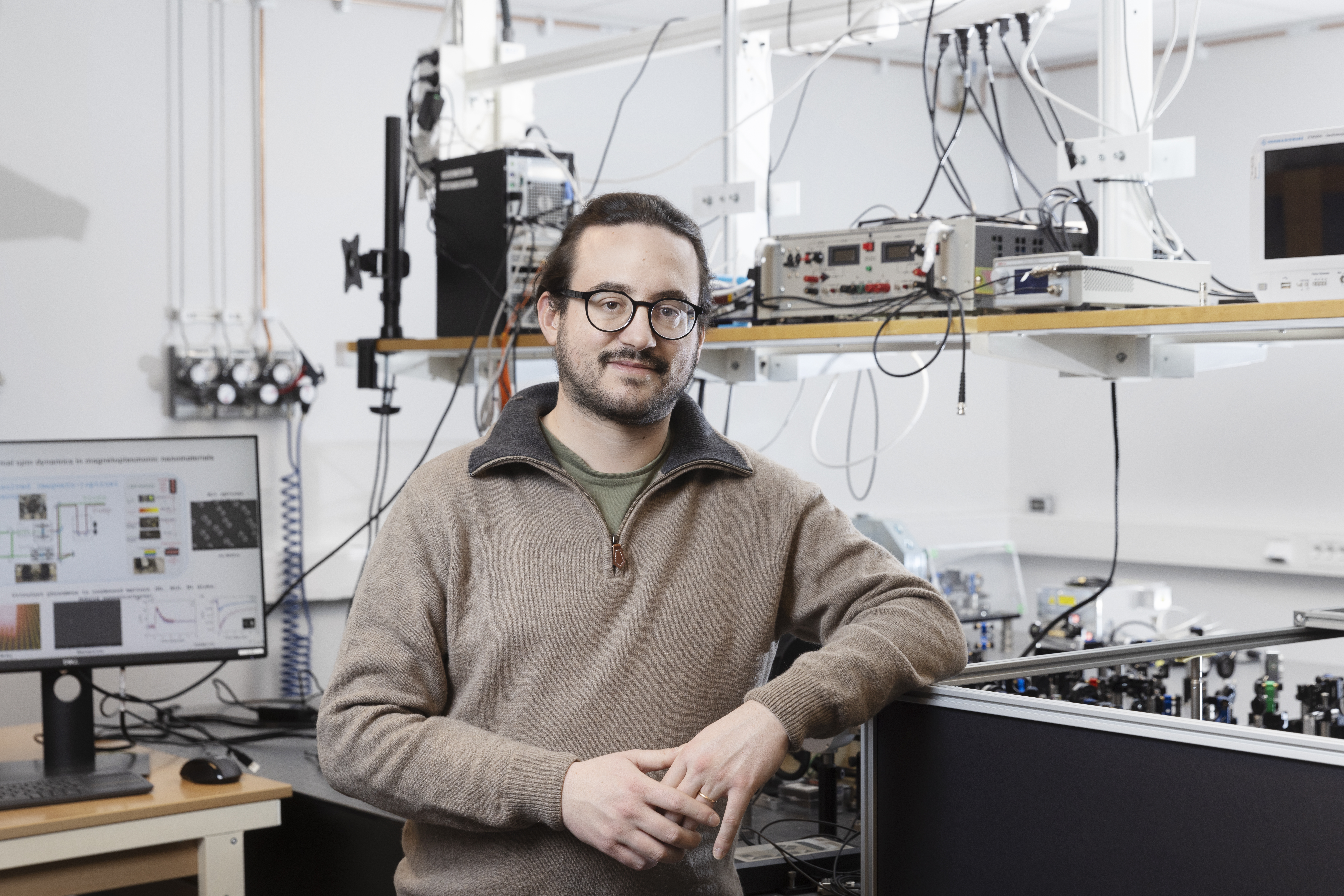 Bildtext: I laserlaboratoriet testar Tlek Tapani och Nicolò Maccaferri hur porös struktur gör att guld kan ta upp mer ljusenergi än vanligt guld.