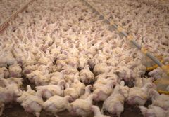 Bild av en stor mängd kycklingar i en trång uppfödningsanläggning.