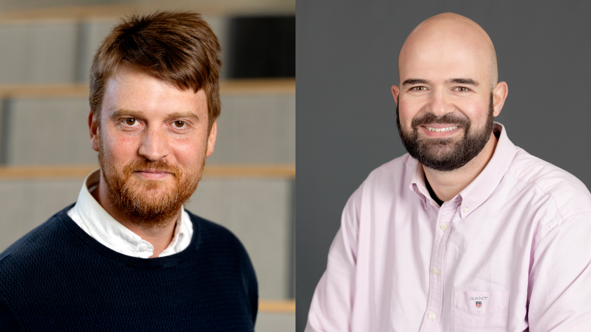 Till vänster porträtt på en man i mörk tröja och vit skjorta under, till höger en man i skjorta.