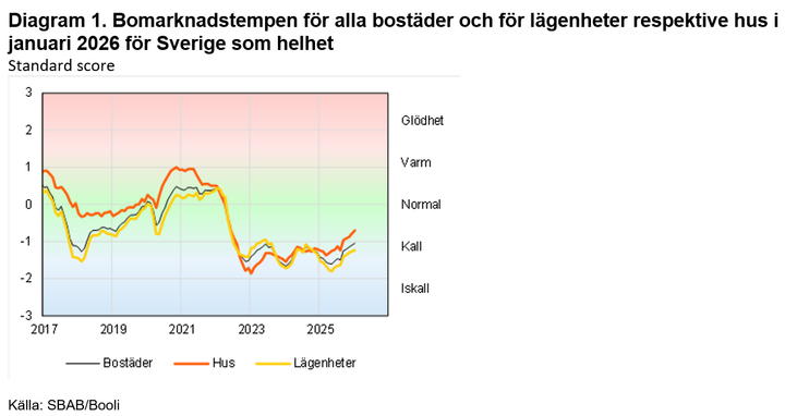 SBAB/Booli:s indikator Bomarknadstempen som mäter hur lätt det är att sälja en bostad, visar att temperaturen på den svenska bostadsmarknaden som helhet fortsatte att stiga trendmässigt i januari. Med nuvarande takt är det dock ganska långt kvar till ett normalläge med undantag för vissa områden.