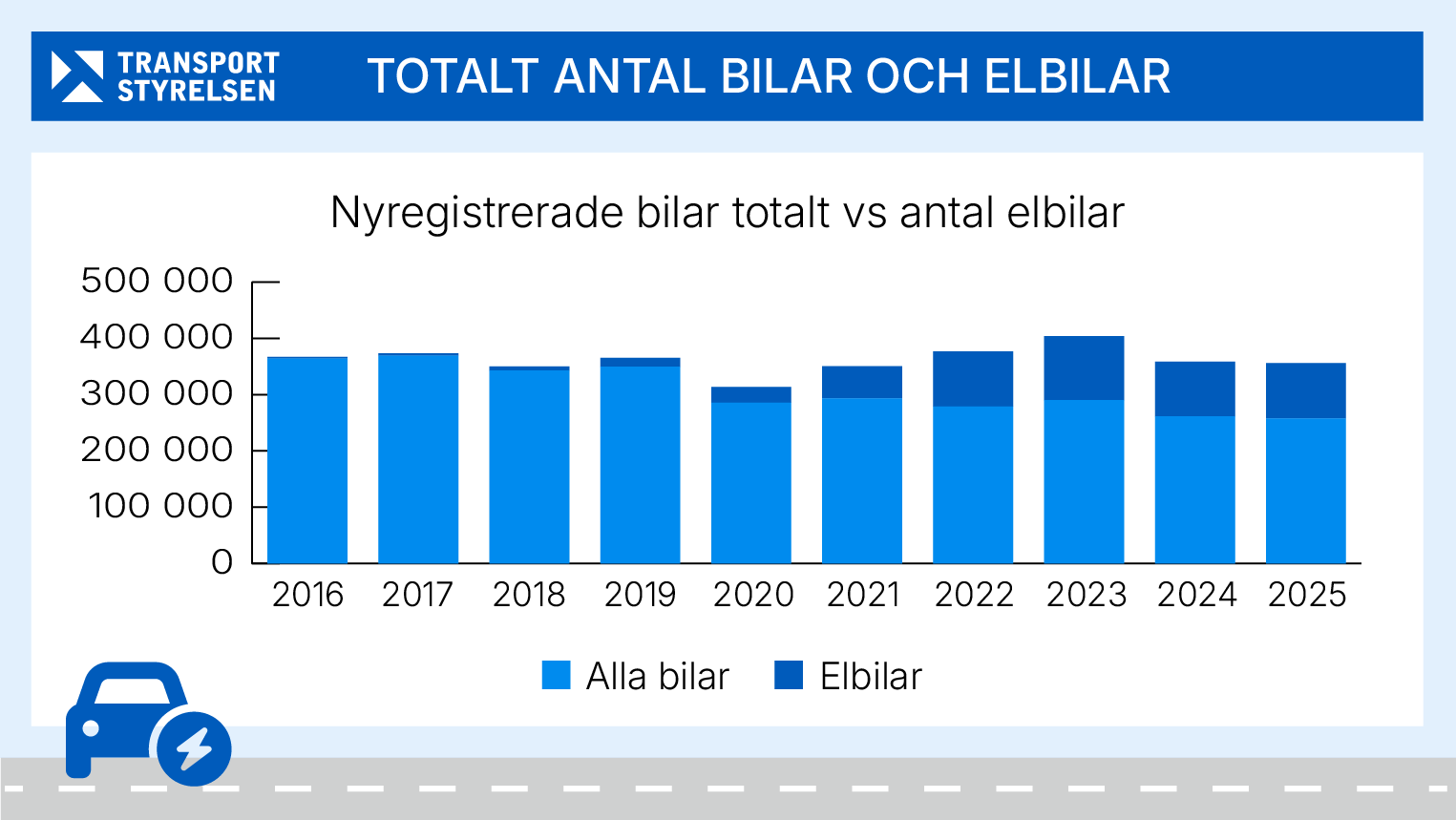 Laddhybrider, både diesel och bensin, har ökat i antal. Det har även antalet elbilar gjort. År 2024 minskade antalet elbilar för första gången sedan mätningarna infördes men 2025 ökade elbilarna igen, medan antalet bilar med förbränningsmotor fortsätter att sjunka.