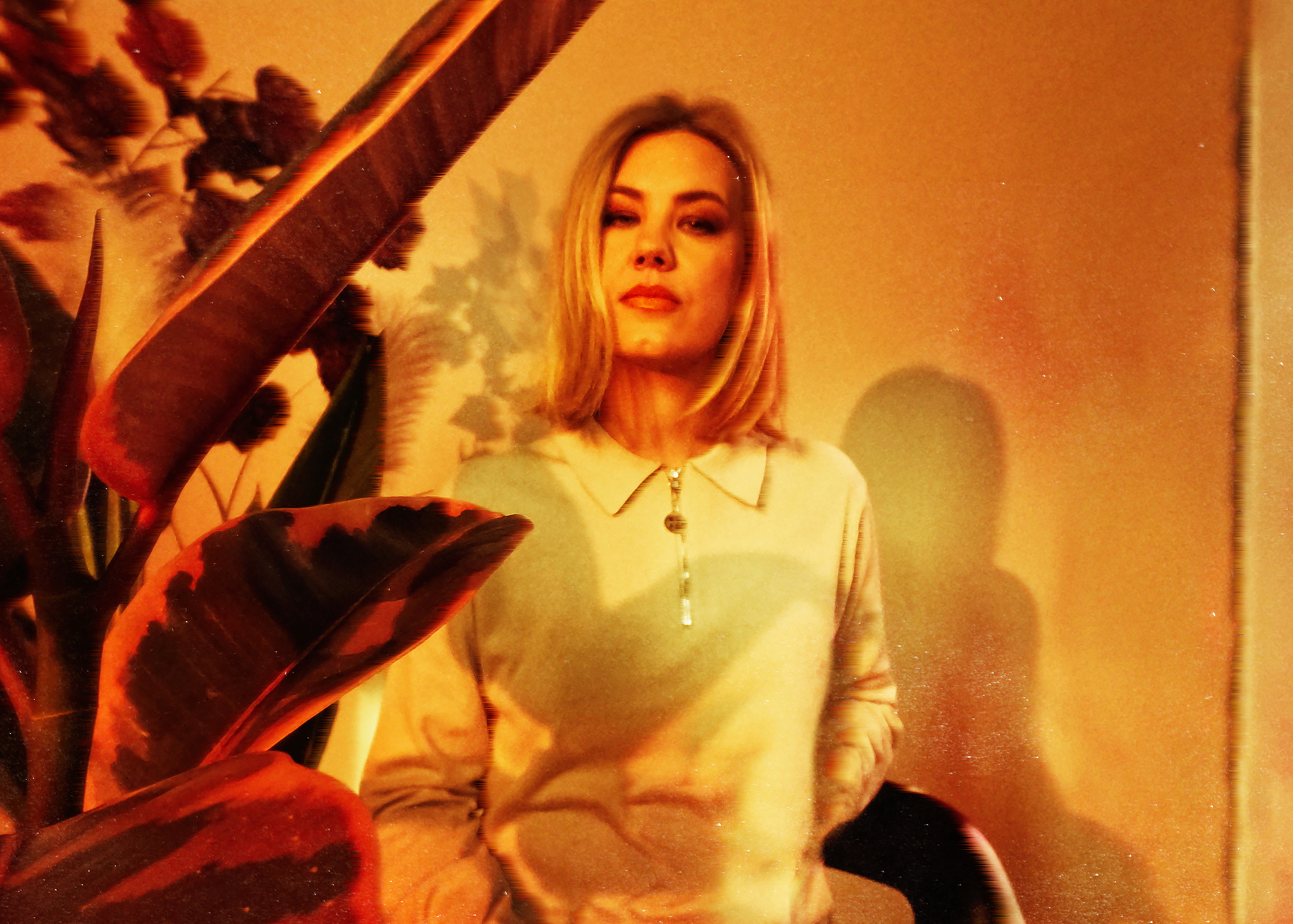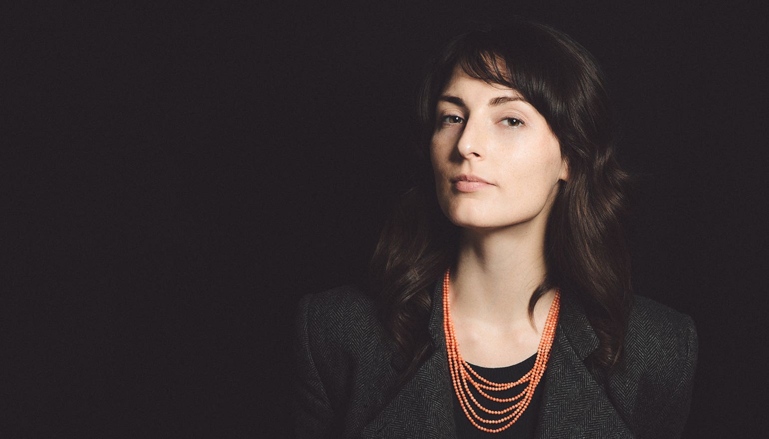 Kvinna med mörkt hår och orange halsband tittar mot kameran.