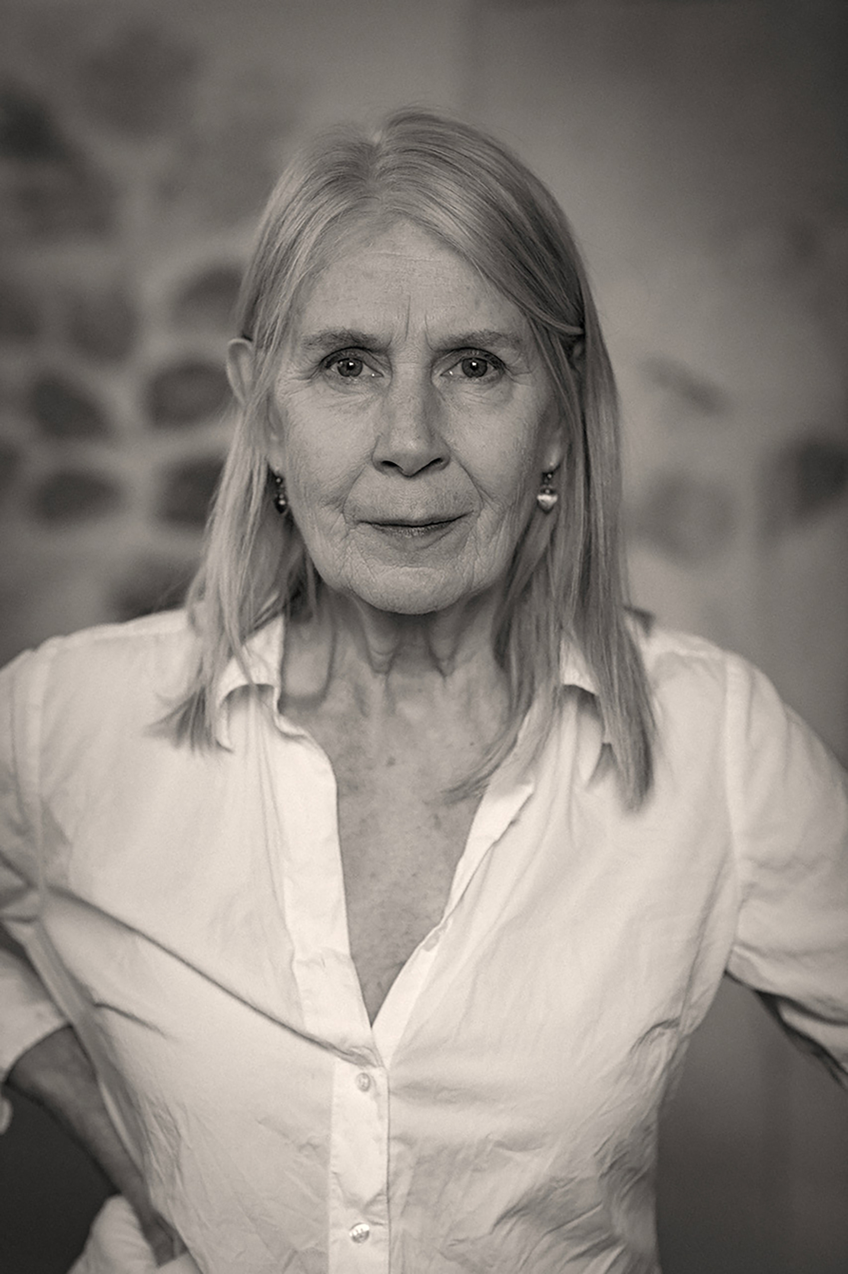 En svartvit bild av en äldre kvinna i vit skjorta som tittar direkt mot kameran.