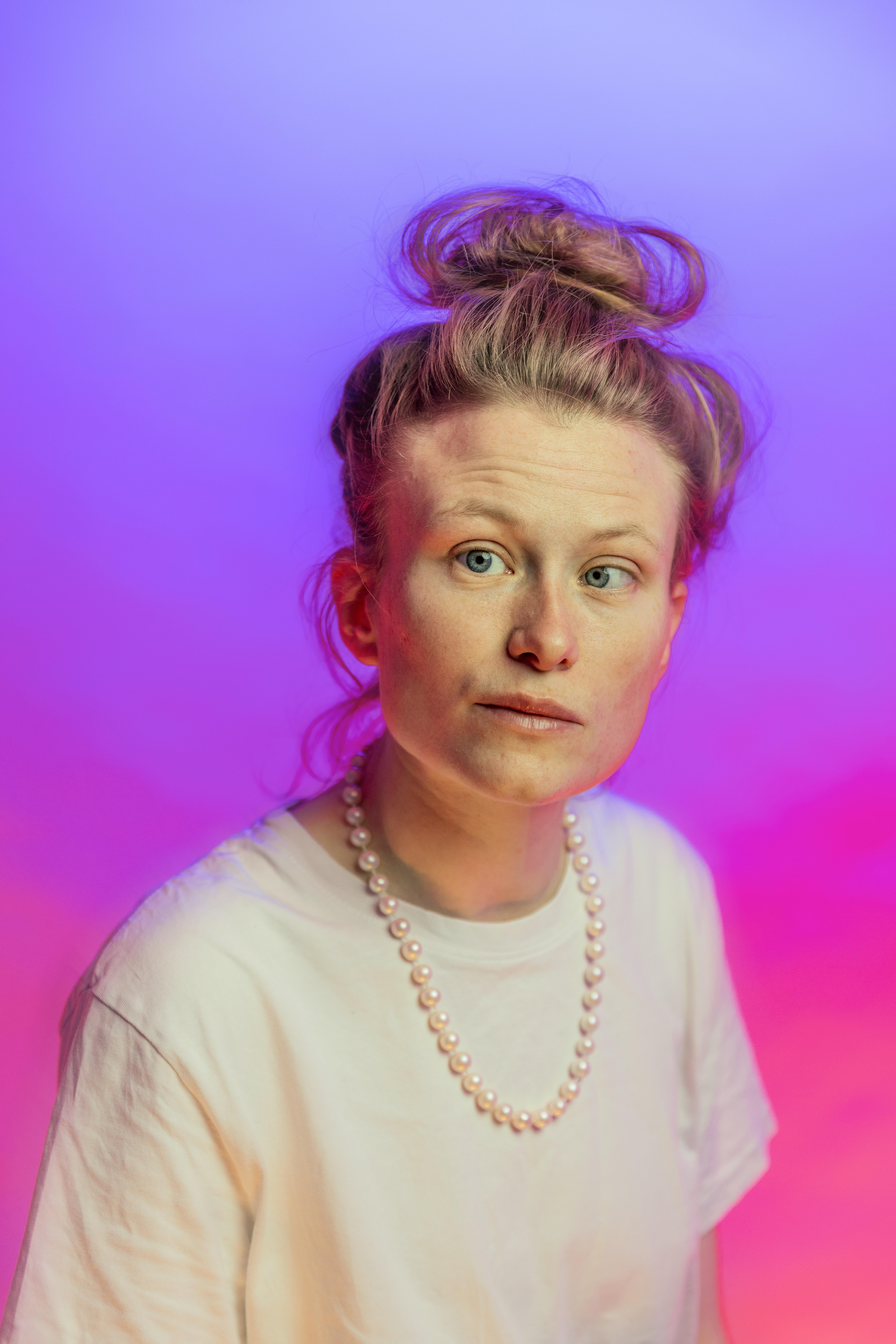 Person med uppsatt hår och pärlhalsband mot en färgglad bakgrund.