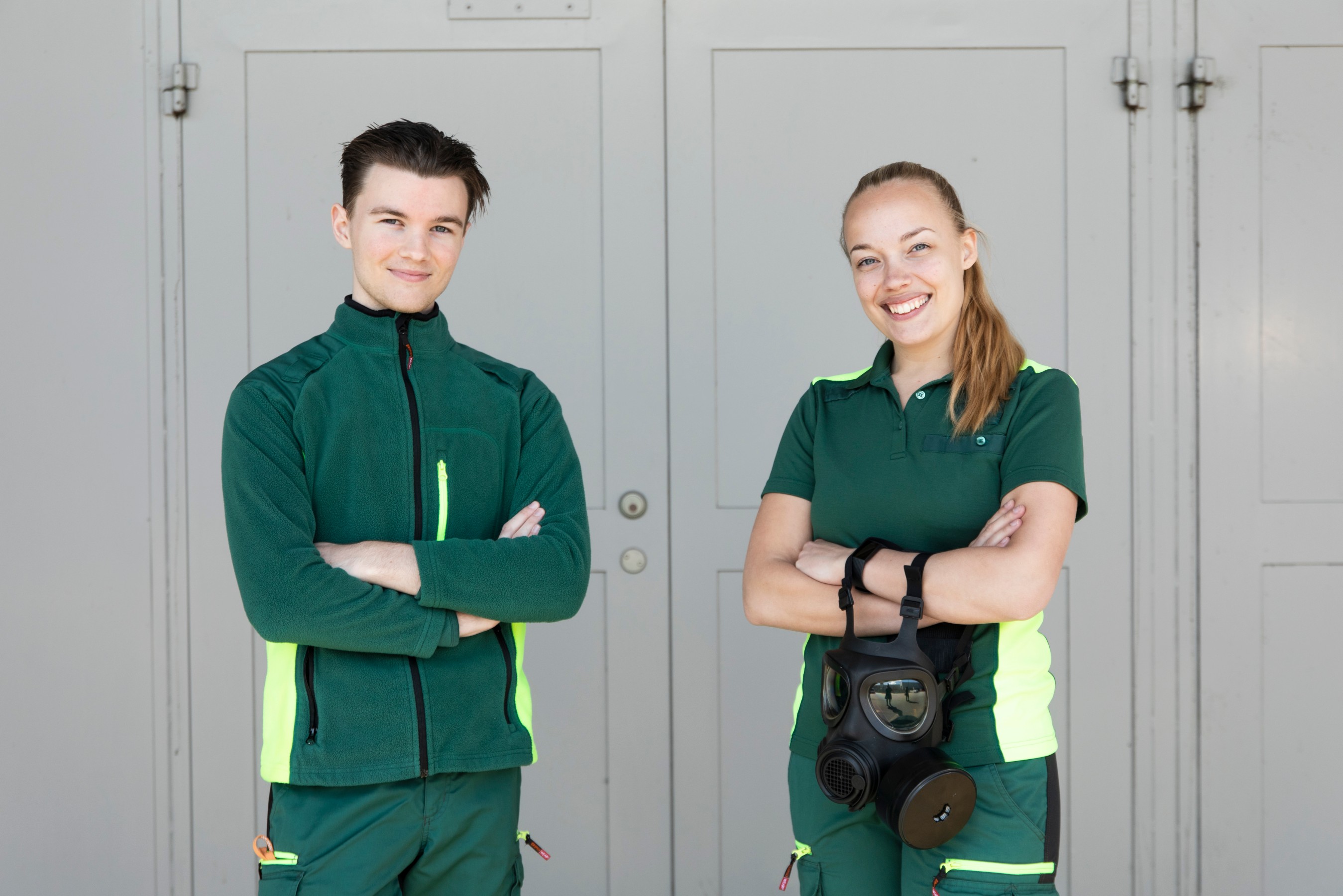 Två personer i gröna arbetskläder står leende med armarna i kors framför en ljusgrå vägg.