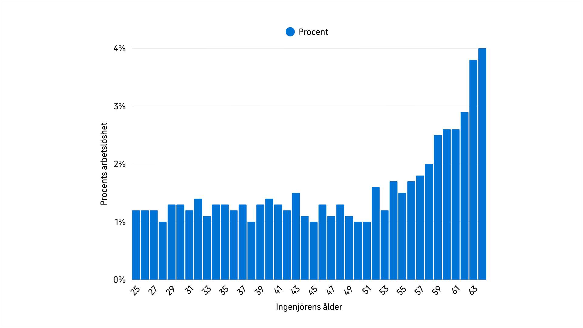 Arbetslösheten bland ingenjörer börjar stiga strax efter 50-årsåldern och ökar därefter exponentiellt fram till 64 års ålder. Arbetslösheten för 64-åriga ingenjörer är nästan fyra gånger högre än arbetslösheten för 44-åriga ingenjörer.