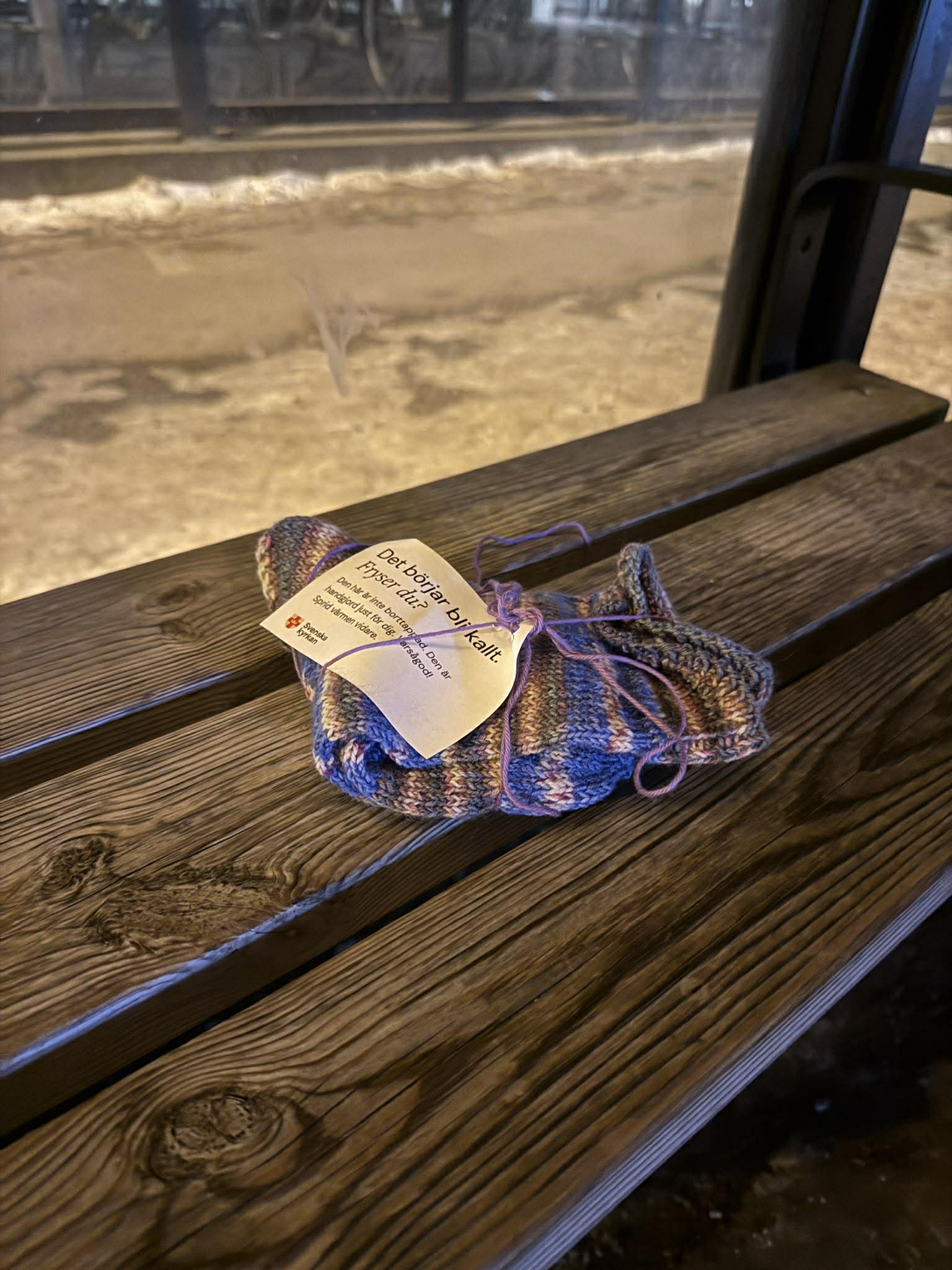 Under natten har värmande gåvor dykt upp på bänkar, vid busshållplatser och på andra offentliga platser runt om i Sverige.