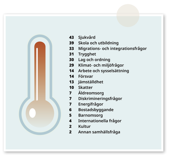 Sjukvård är fortfarande den samhällsfråga som flest unga tycker är viktig. Därefter följer skola och utbildning. Trygghet samt lag och ordning är några av de samhällsfrågor som ökat mest jämfört med 2018. Det har också blivit något vanligare att unga oroar sig för krig och terrorism och att de tycker att försvaret är en viktig samhällsfråga.
