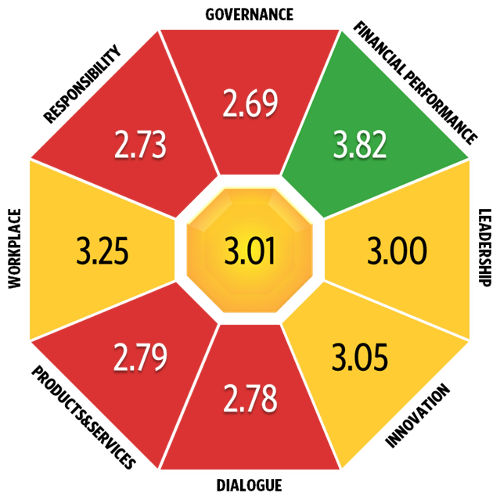 Organisationerna utvärderades med hjälp av Reputation and Trust Analytics Reputation&Trust-undersökningsmodell, där en organisations anseendepoäng bildas som ett genomsnitt av åtta olika områden. Områdena är bolagsstyrning, ekonomi, ledning, innovation, interaktion, produkter & tjänster, arbetsplats och ansvar. Undersökningen använde en femgradig betygsskala (1–5).