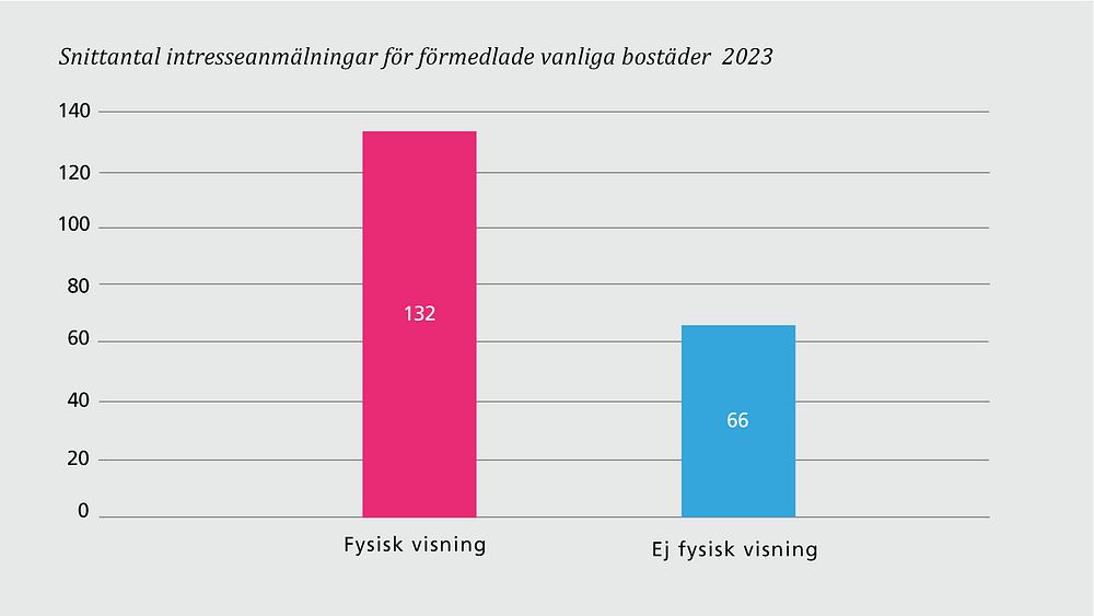 Diagrammet visar att bostäder med fysiska visningar får dubbelt så många intresseanmälningar jämfört med de utan fysiska visningar. Fler intresseanmälningar innebär sannolikt ett större urval av intresserade, något som ökar chansen att hitta en bostadssökande som uppfyller hyresvärdens krav. Att erbjuda fysiska visningar kan därför vara en strategisk fördel för hyresvärdar för att attrahera större intresse och få sina bostäder uthyrda snabbare.