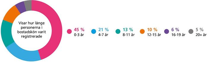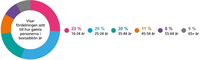 Den 1 juni 2024 var 134 836 personer registrerade i bostadskön. Andelen som aktivt söker bostad, det vill säga personer som lämnat fem eller fler intresseanmälningar det senaste året, ligger på 11 %. De allra flesta använder alltså bostadskön som en trygghetsförsäkring för framtiden snarare än ett medel för att skaffa en bostad här och nu. Du kan lära känna bostadskön lite mer i cirklarna nedanför.