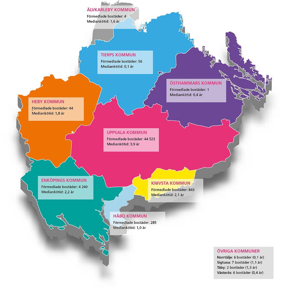 I kartan nedan visas i hur många bostäder som förmedlats i respektive kommun i regionen samt mediankötiden.