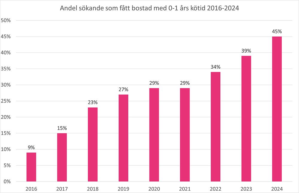Sedan 2016 har allt fler fått en bostad med kort kötid. 2016 gick exempelvis 9 % av alla bostäder till en sökande med bara 0–1 års kötid. Förra året hade 39 % av alla som skrev ett hyreskontrakt en kötid på 0–1 år och hittills i år ligger siffran på hela 45 %.