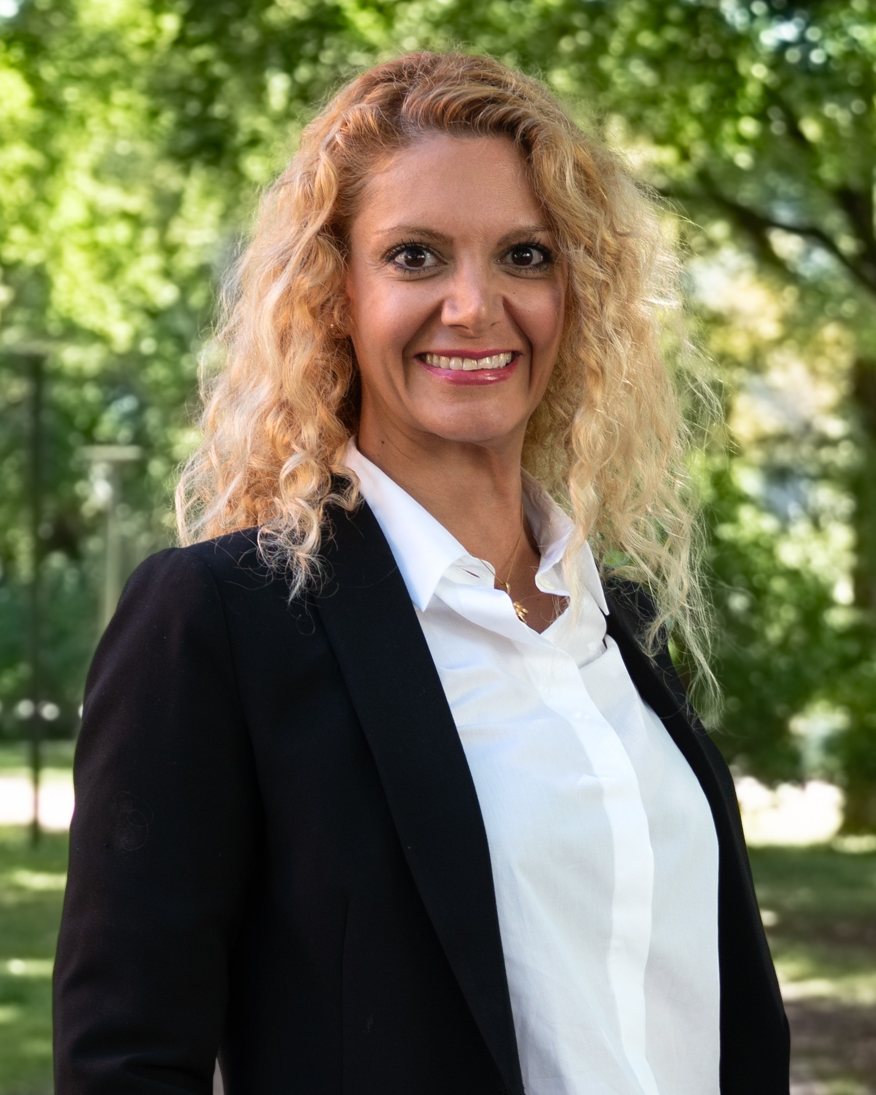 Kvinna i vit skjorta och svart kavaj ler och tittar in i kameran