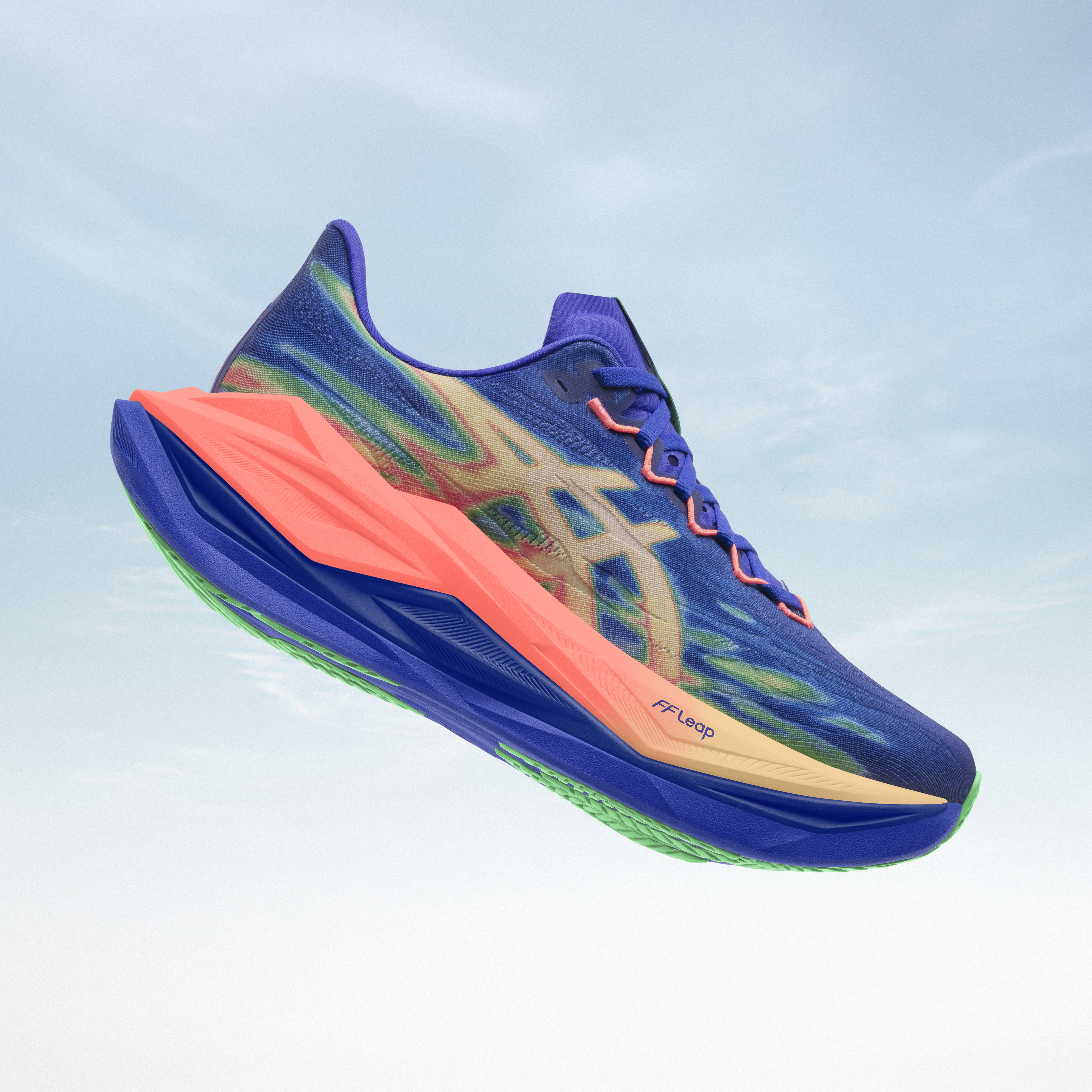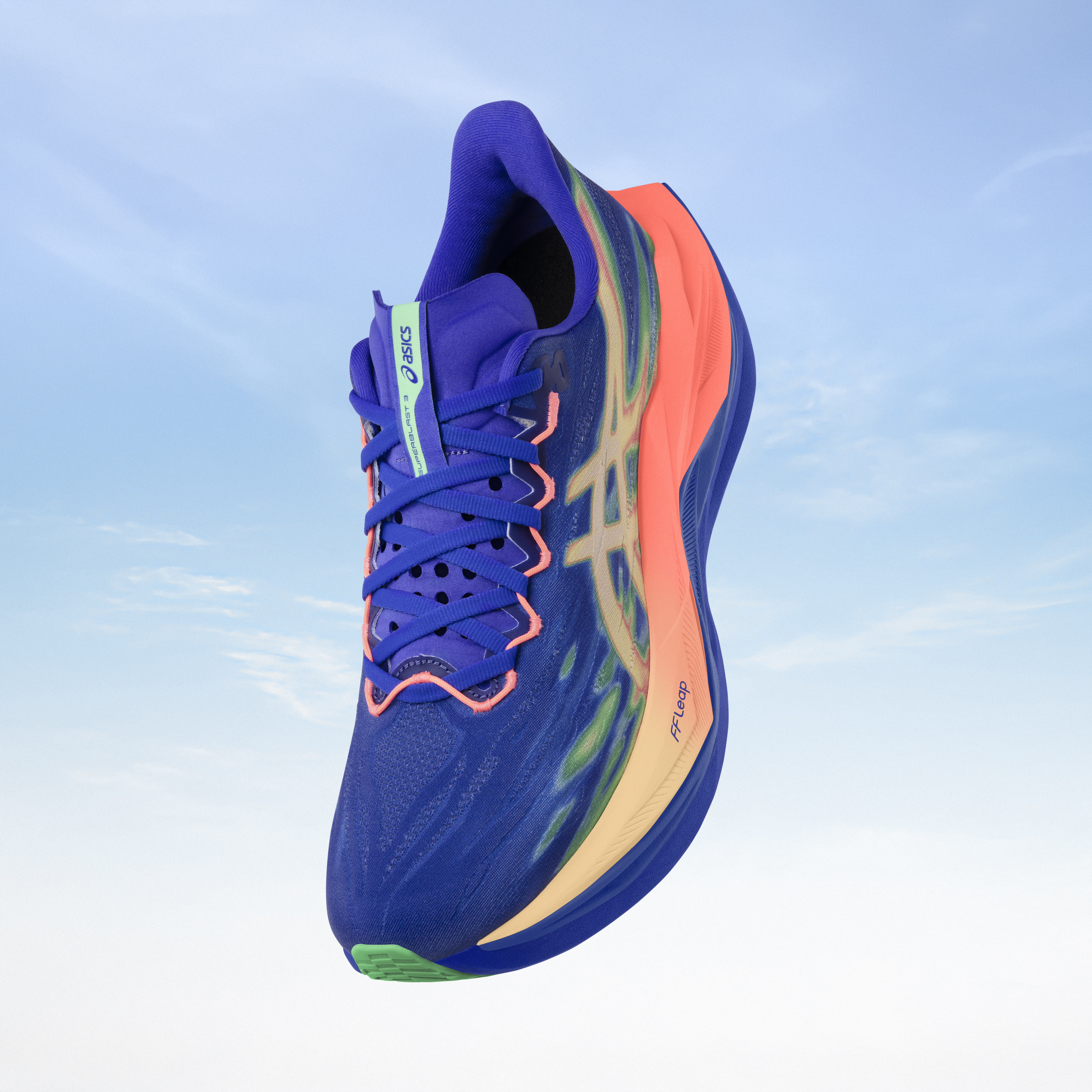 SUPERBLAST™ 3 bygger vidare på succén SUPERBLAST™ 2 och till denna modell introduceras FF LEAP™, ASICS hittills lättaste och mest energigivande skum. Materialet ersätter det tidigare FF TURBO™ PLUS-skummet som tillsammans med en uppdaterad ”trampolineffekt” i yttersulan ger skon ett kraftfullare frånskjut som sparar på löparens energi utan att tumma på komforten.