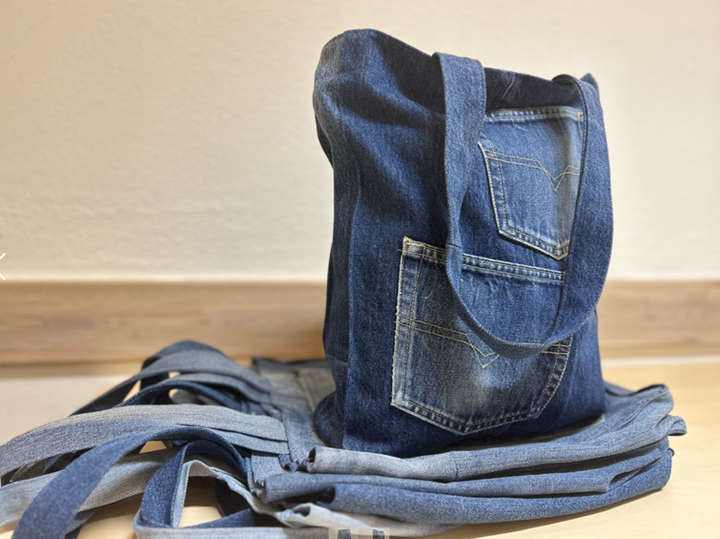 Initiativet kommer från Syverkstaden i Maria kyrka i Järfälla församling där kvinnor i arbetsträning tagit fram denna väska tillverkad av denimtyg som samlats in för återbruk av Kappahl Group.
