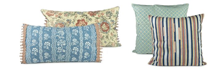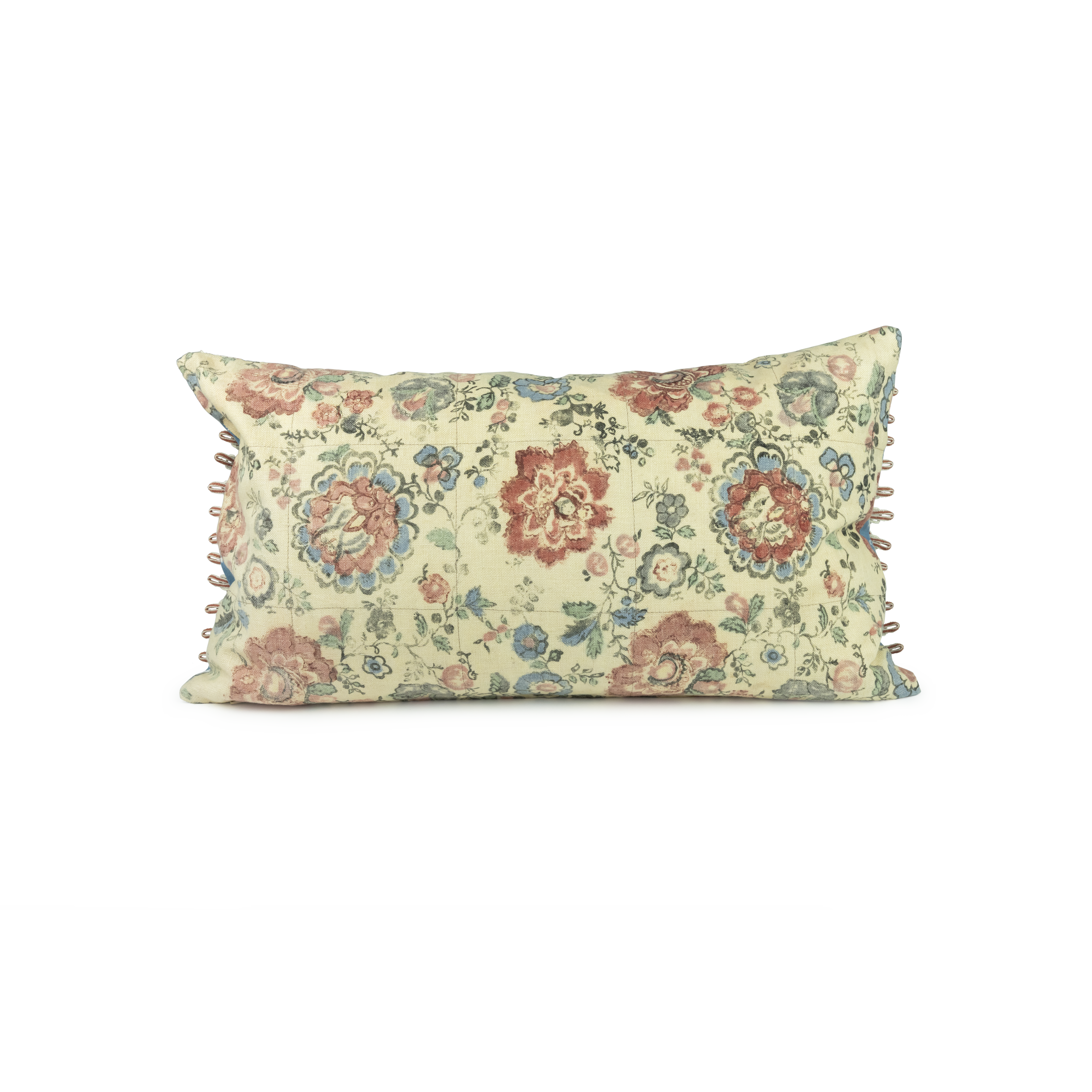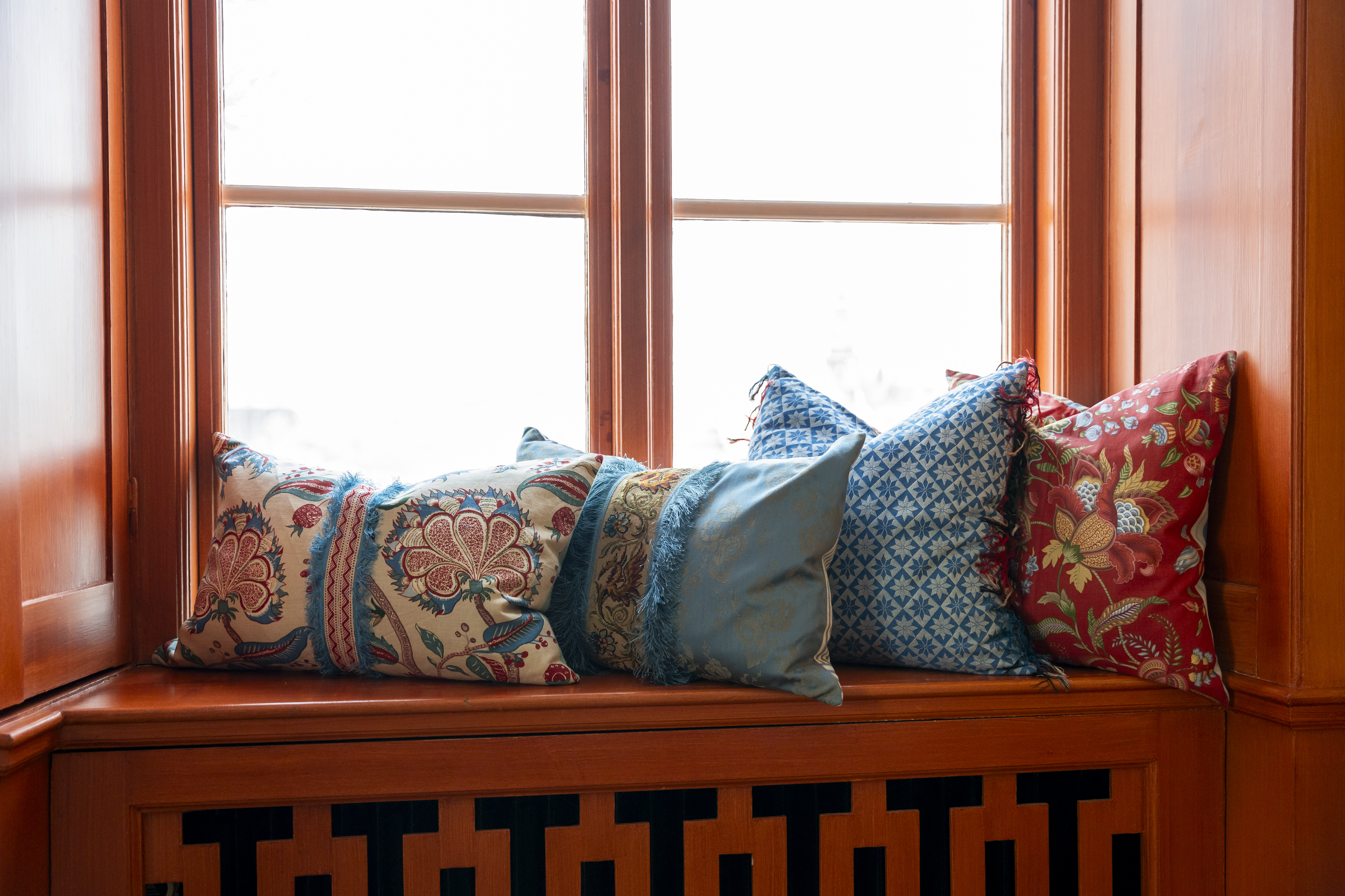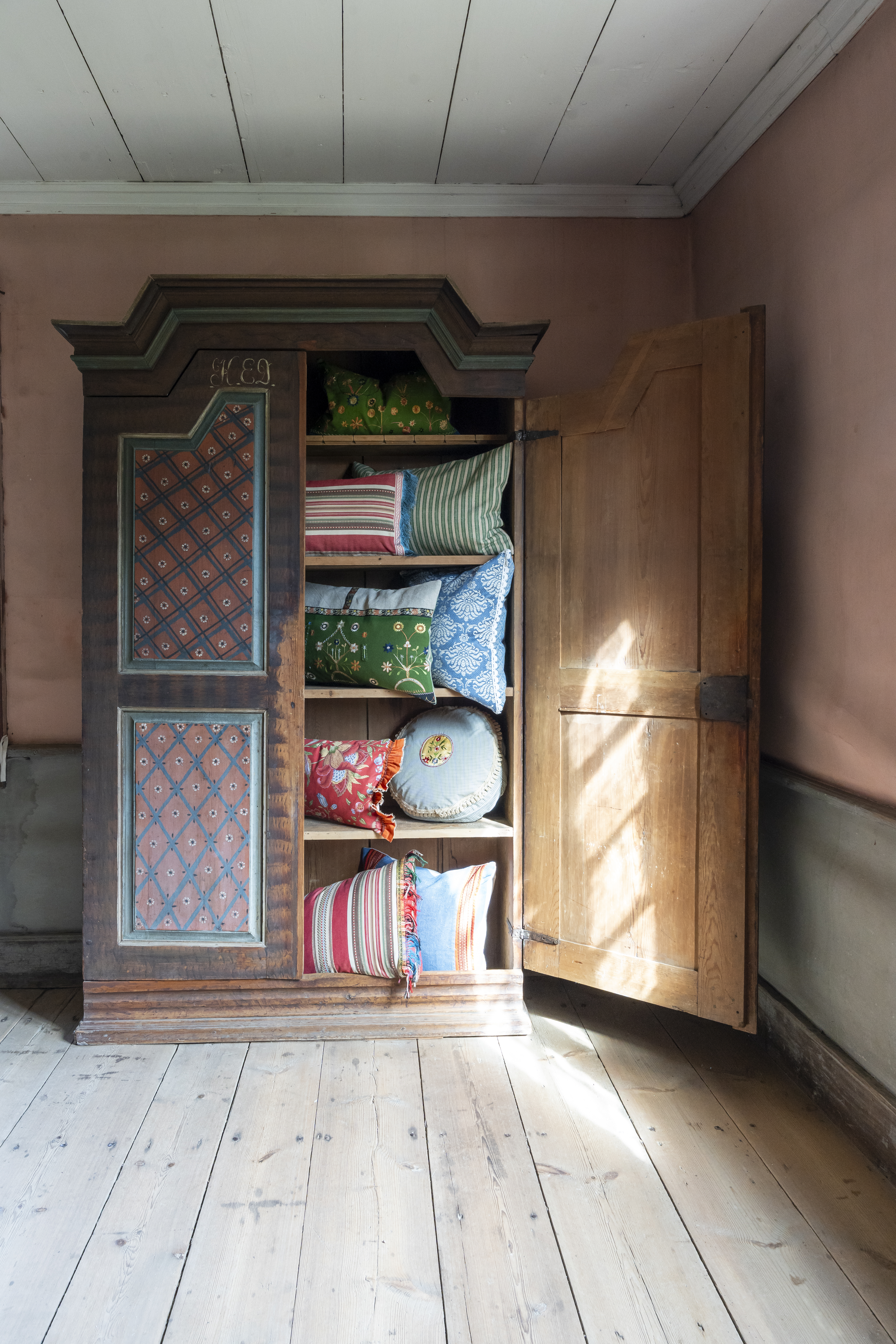 Vårens släpp rymmer en rik variation av mönster, strukturer och textila tekniker. Här möts stora stiliserade 1700-talsrosor och mindre blom- och bladmotiv, hämtade från 1800-talets tryckta bomullstyger. Strama ränder kombineras med stiliserade växter i lapptäckesteknik. Alla kuddfodral har olika fram- och baksidor, vilket förstärker det hantverksmässiga uttrycket.