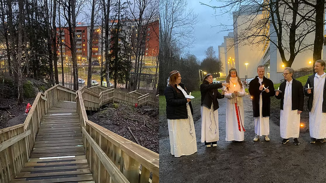 Trappan slingrar sig upp mellan träden och leder från Tingsparken, Björnkullavägen, till Visättravägen. Förra veckan invigdes den. Tidigt på torsdagsmorgonen tändes marschaller och Huge var på plats tillsammans med Victoriahem och kommunen för att möta dem som pendlar till tåget, som nu för första gången kunde använda trappan. Som en extra överraskning var även ett luciatåg på plats.
