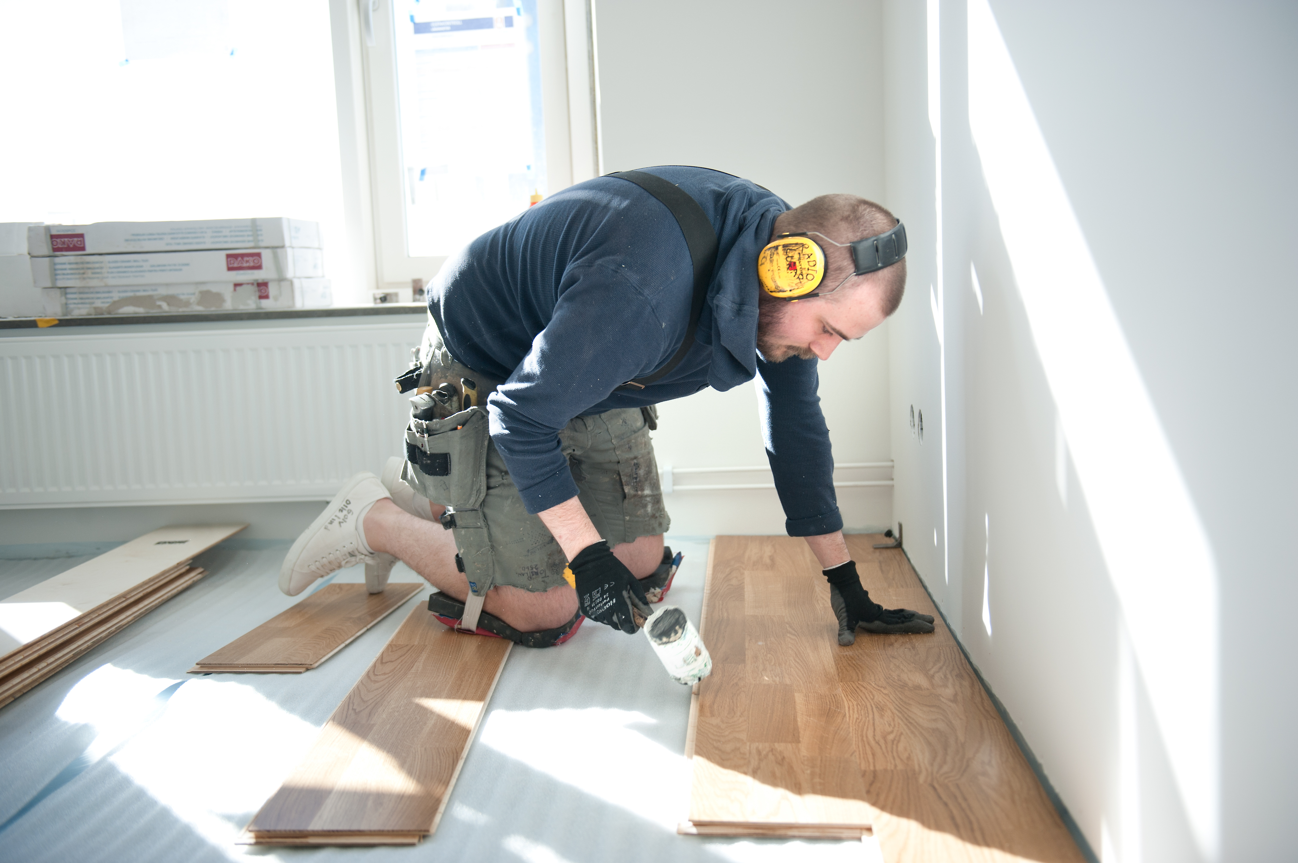 En person installerar trägolv inomhus, och bär hörselskydd och en verktygsbälte.
