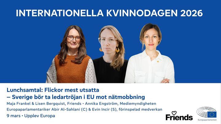 I samband med den internationella kvinnodagen bjuder stiftelsen Friends och Europaparlamentets kontor i Stockholm in till ett lunchsamtal på Kulturhuset Stadsteatern den 9 mars om hur nätmobbning kan förebyggas, med ett särskilt fokus på flickors och unga kvinnors utsatthet.