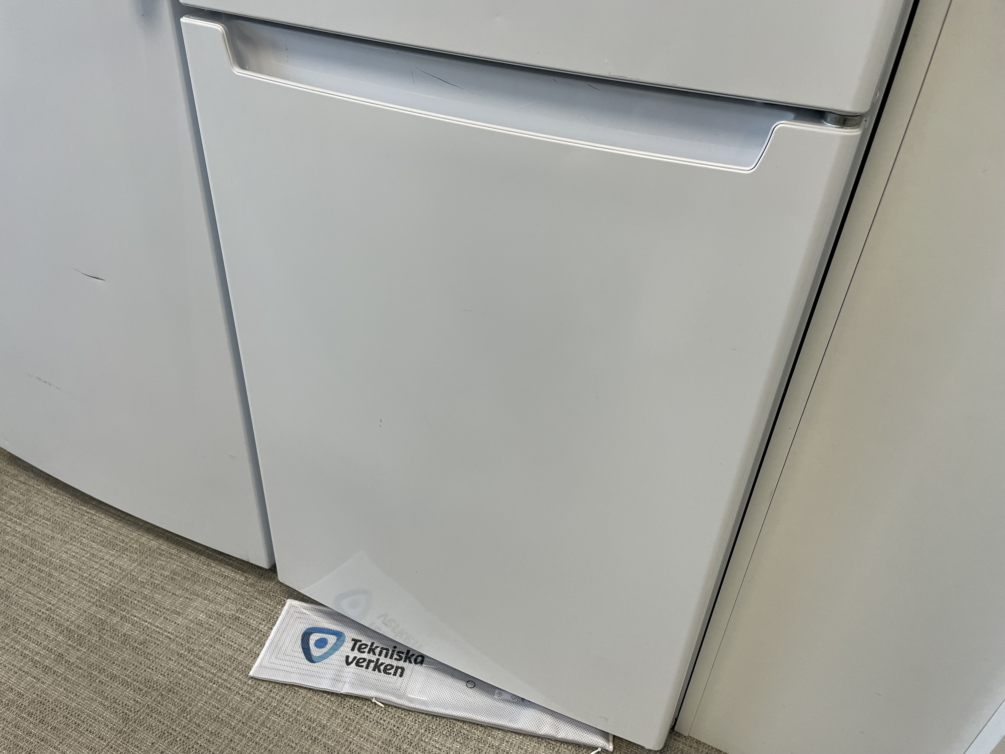 Ett vitt kylskåp i ett kök med en droppmatta som sticker ut undertill, märkt med logotypen “Tekniska Verken”.