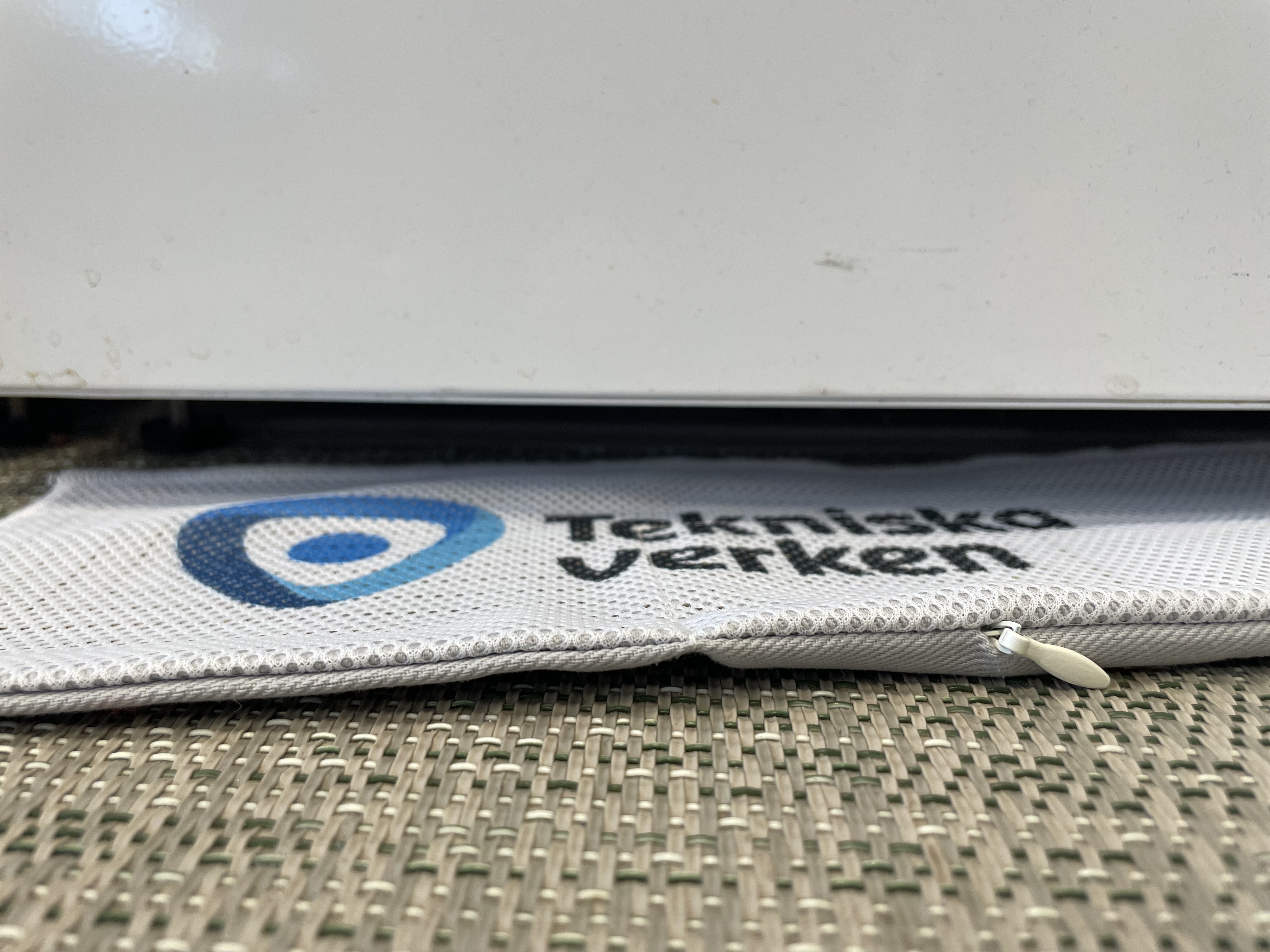Närbild av en vit droppmatta med texten ”Tekniska Verken” som sticker ut under en diskmaskin på ett vävt köksgolv.