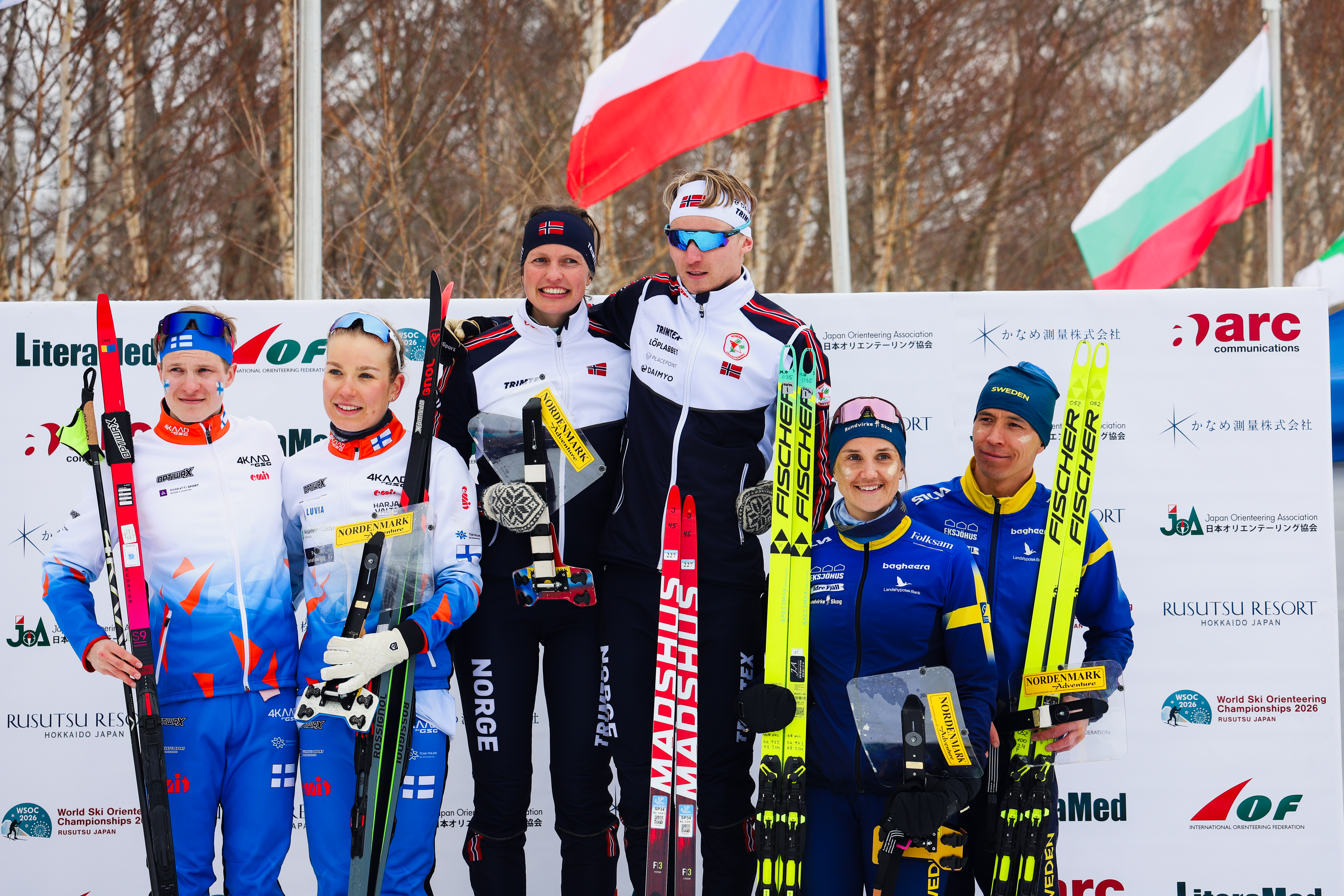 Det bjöds på en tät och rafflande sprintstafett som avslutning på VM i skidorientering i Japan. Ut på sista sträckan var sex lag inom 14 sekunder. Norge tog till slut guldet en sekund före Finland och två för Sverige.