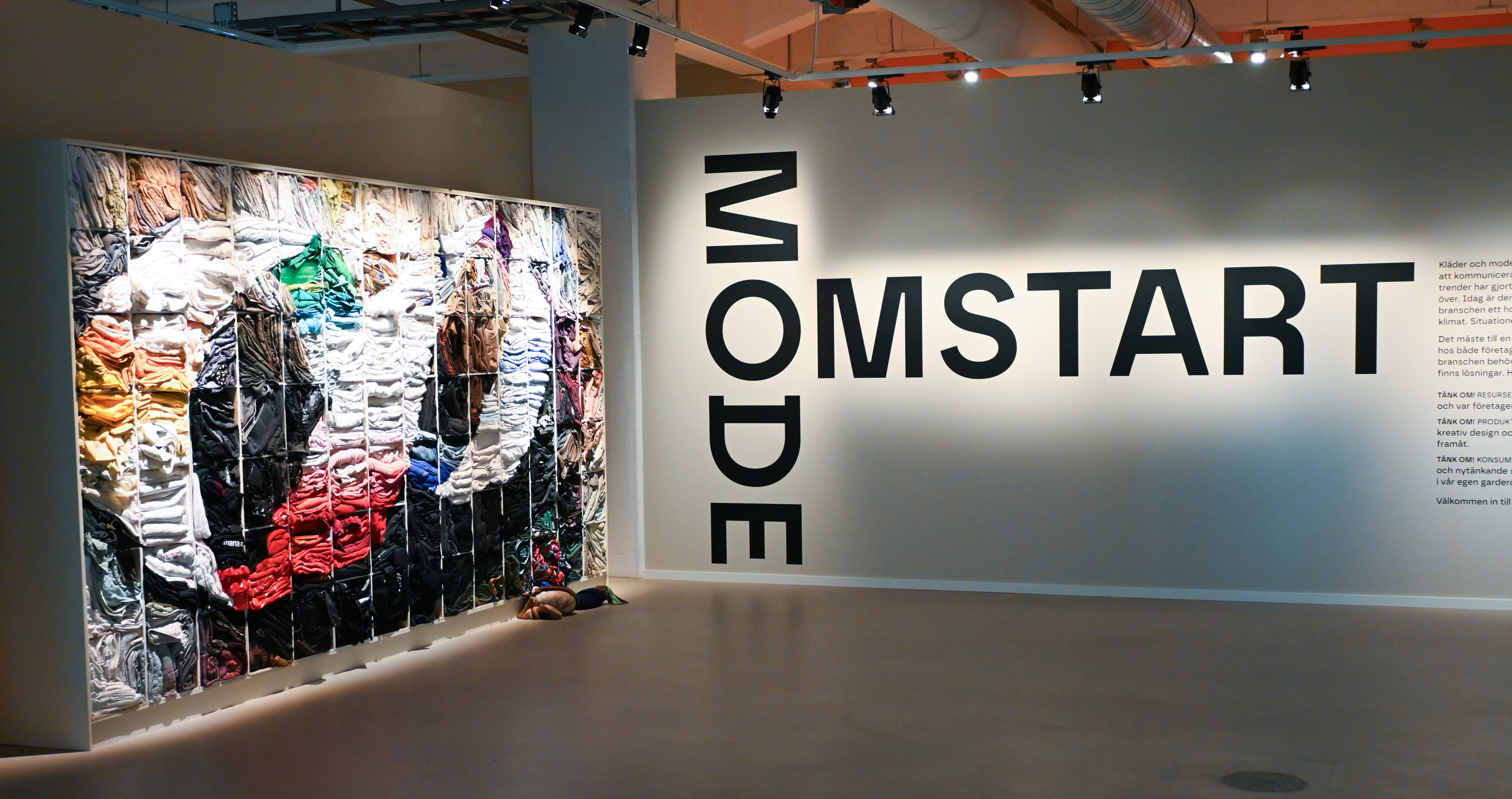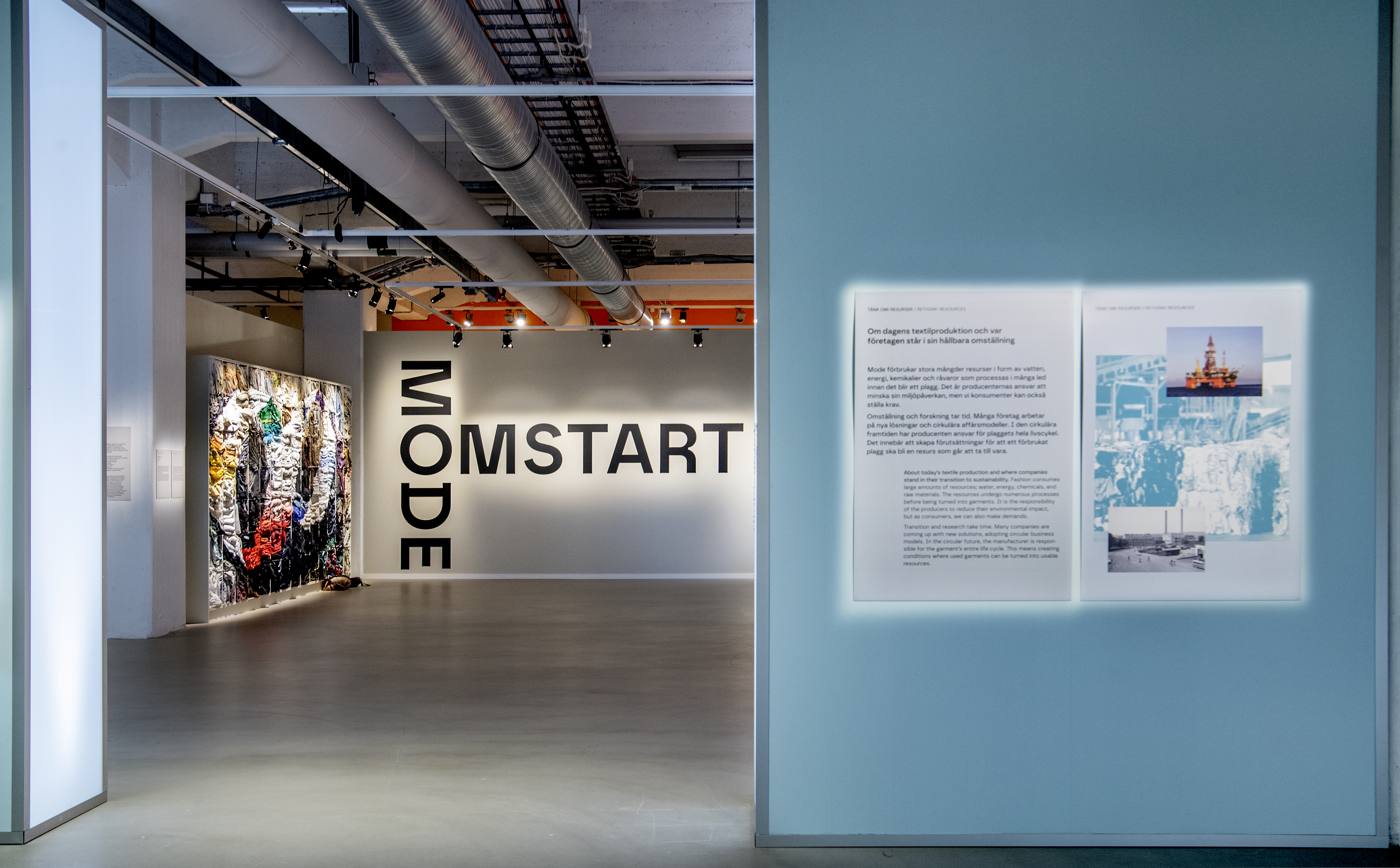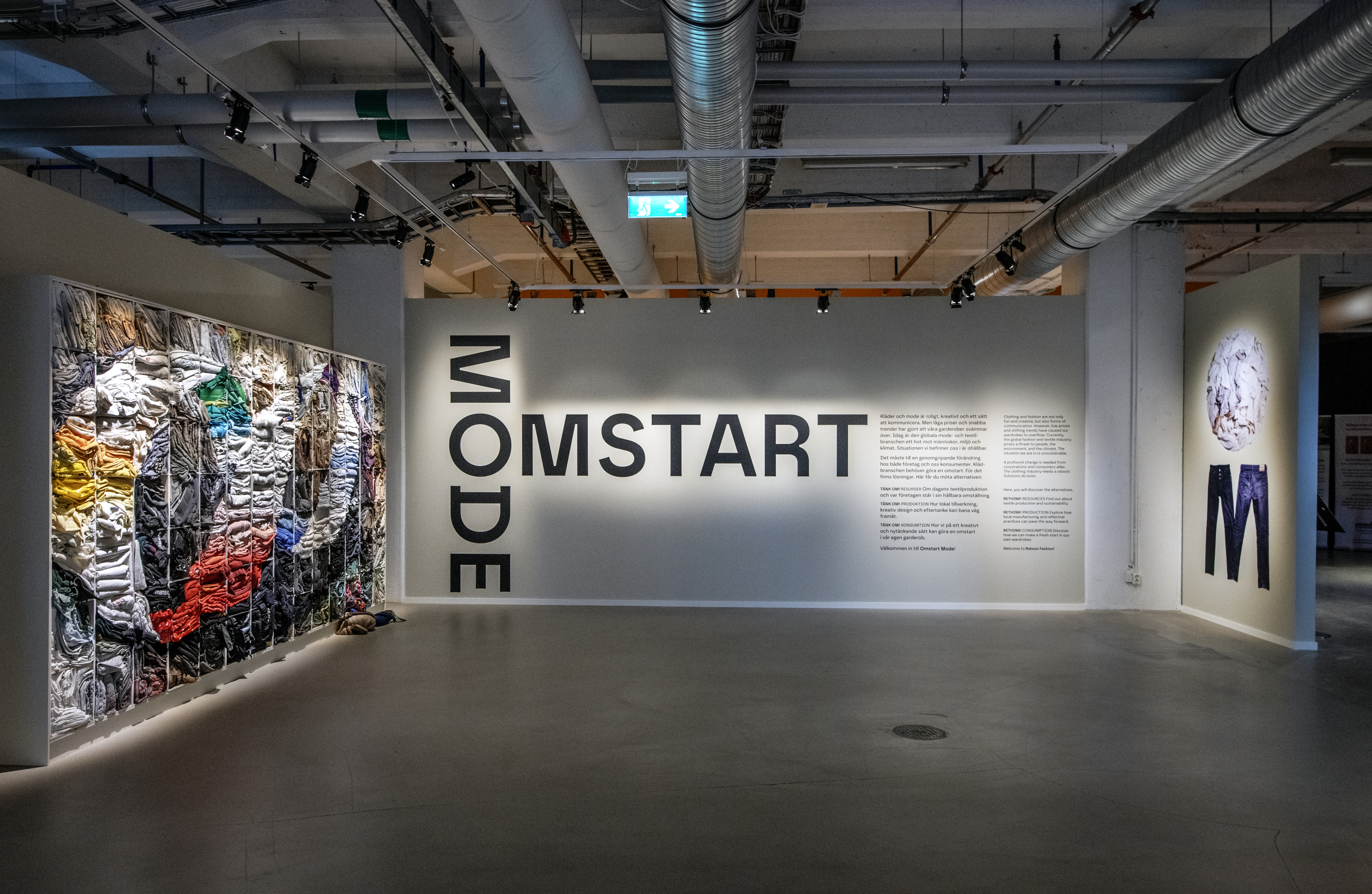 Utställningen Omstart Mode presenterar exempel på innovativt nytänkande hos bl.a. företag och forskare inom branschen, tillsammans med handfasta tips om hur du vårdar din garderob. Utställningen visar också hur vi kan lära av vår historia och det hållsbarhetstänk som var självklart för de flesta förr i tiden.