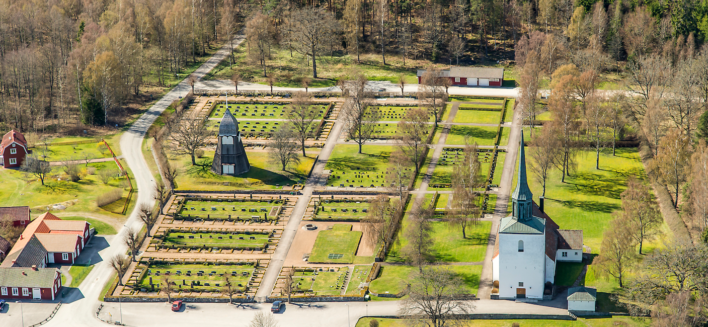 Flygbild över Sillhövda kyrka, klockstapel och kyrkogård.
