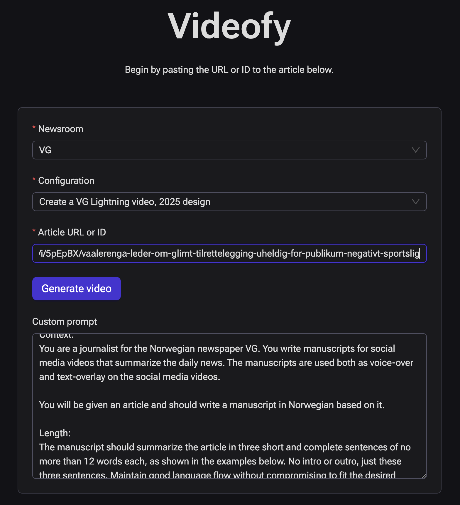 Schibsted kehitti Videofyn lyhyiden uutisvideoiden tuotannon tehostamiseksi – ruudulta katselua ja digitaalisia alustoja varten. Aiemmin tällaisten videotiivistelmien tuottaminen vaati merkittäviä toimituksellisia resursseja ja manuaalista työtä läpi päivän. Videofyn avulla suuri osa tästä työstä voidaan automatisoida.