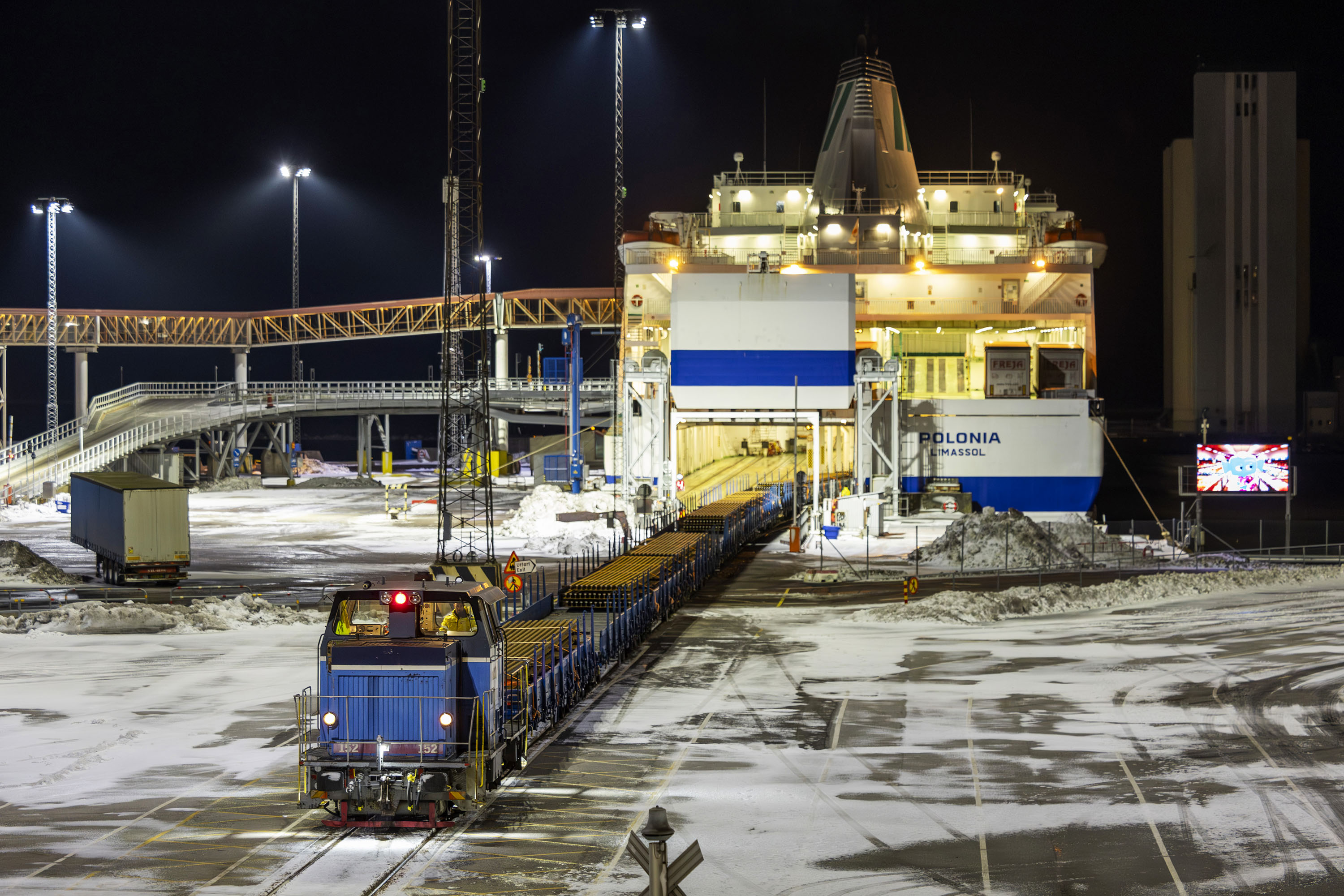 M/S Polonia byggdes 1995. På däck finns fem spår som järnvägsvagnarna placeras på och totalt ryms 640 längdmeter tågvagnar.