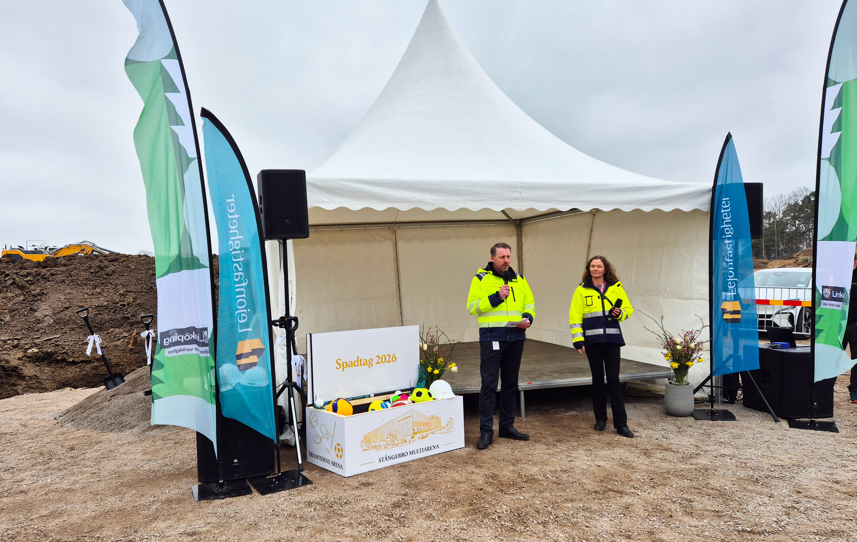 En man och kvinna i gula varseljackor står  tillsammans framför ett vitt tält med varsin mikrofon i handen och talar inför spadtaget