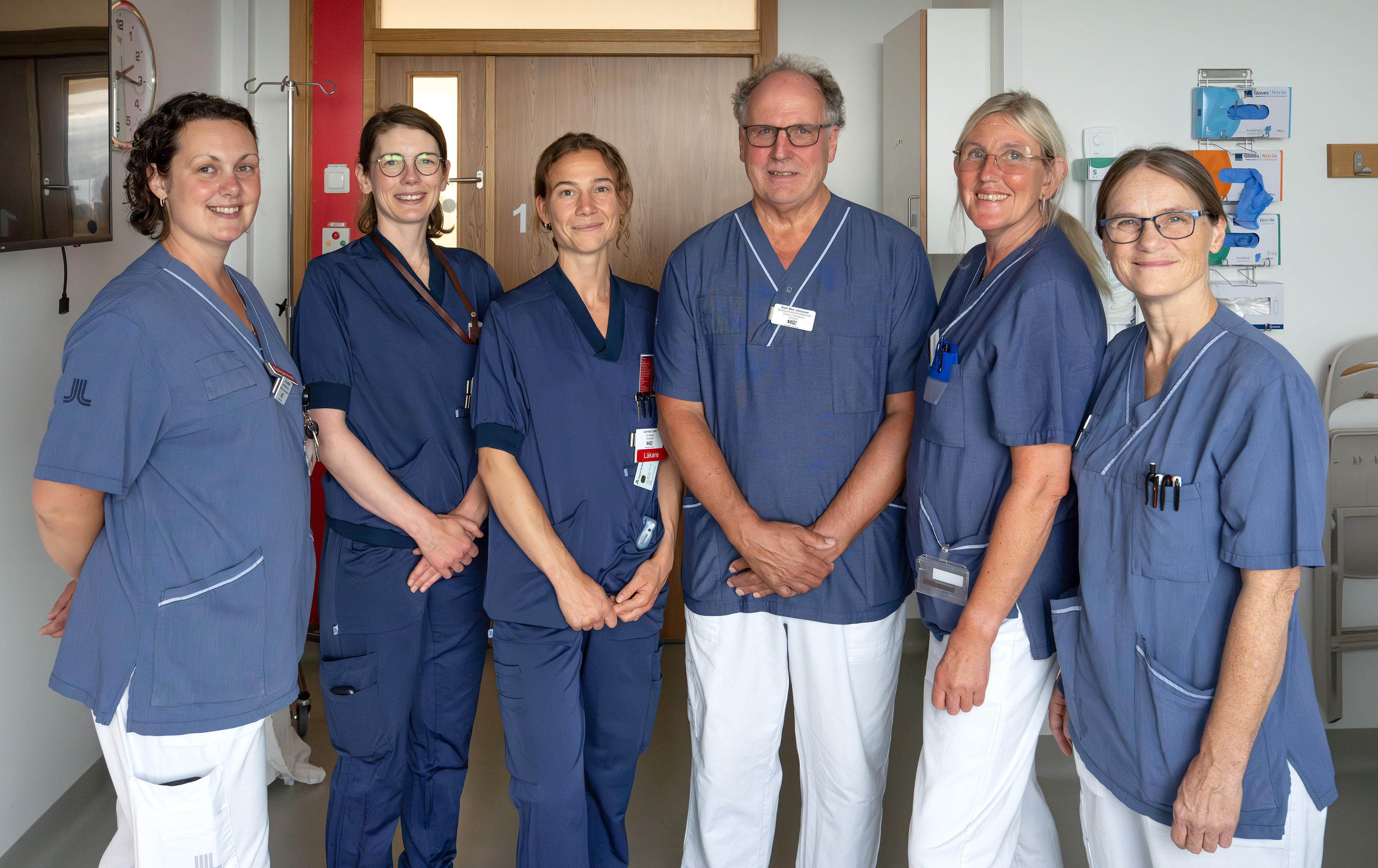 På bilden från vänster till höger: Ellen Sallfeldt (fysioterapeut), Johanna Rundgren (specialistläkare), Lovisa Lind (ST-läkare), Karl-Åke Jansson (verksamhetsområdeschef), Monica Renström (sjuksköterska, vårdenhetschef), Cristina Larsson (sjuksköterska). Saknas: Sogol Mohammadi (sjuksköterska).