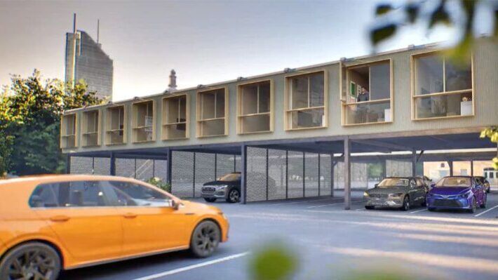 Med kompakte, modulbaserte leiligheter på stålkonstruksjoner kan man utnytte ubrukt plass på parkeringsplasser. Alt kan enkelt settes opp, flyttes eller tas ned igjen etter behov.
