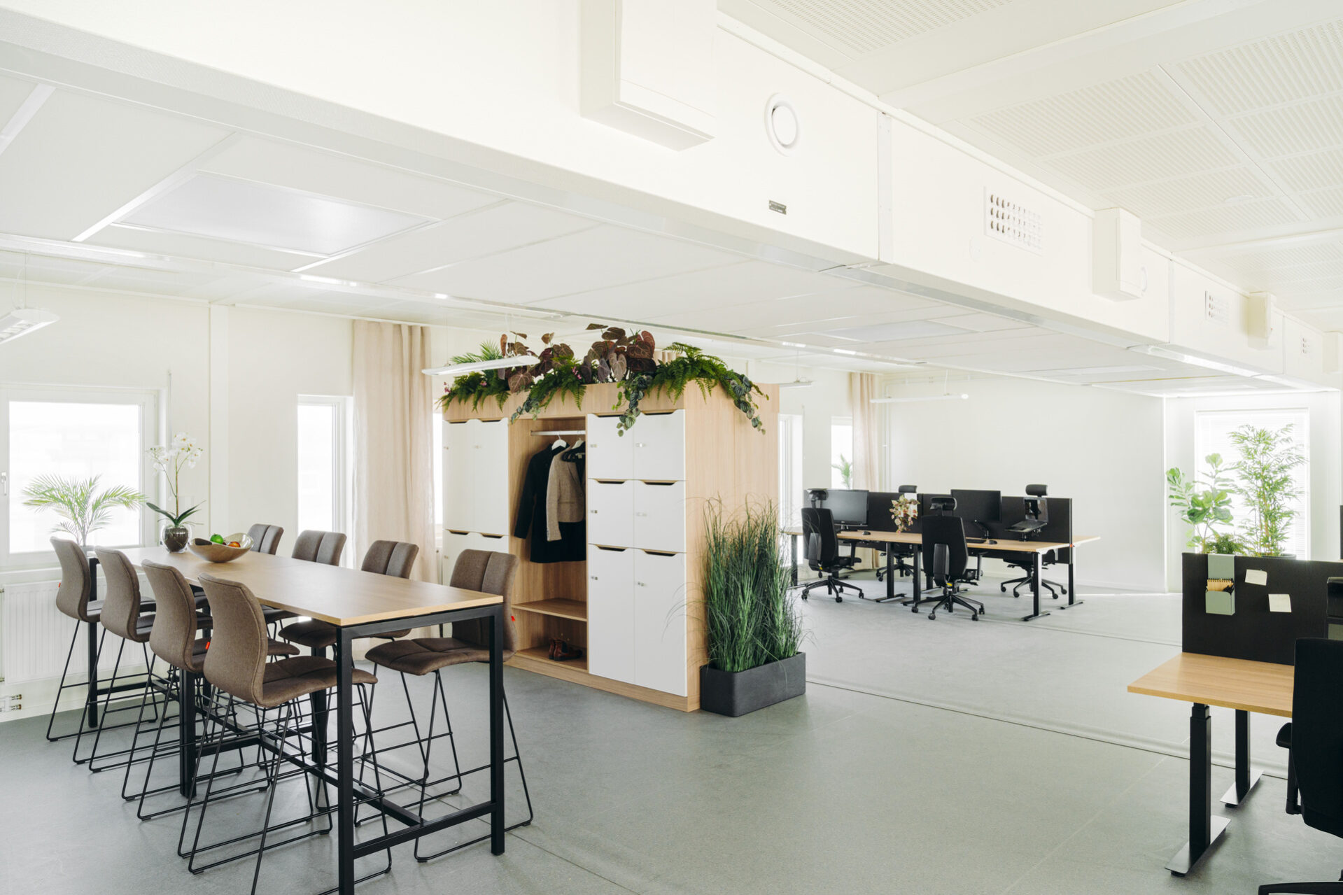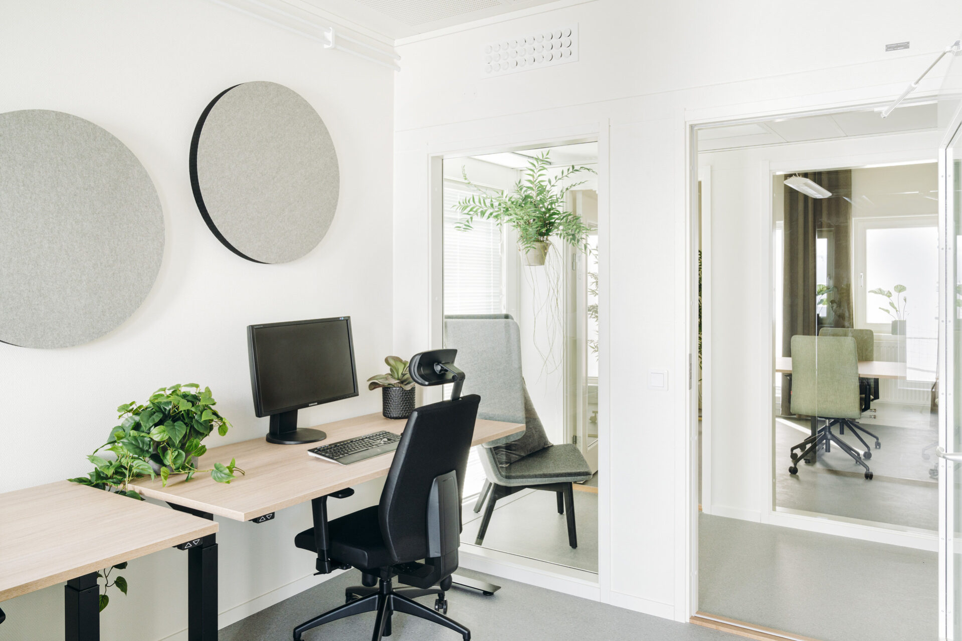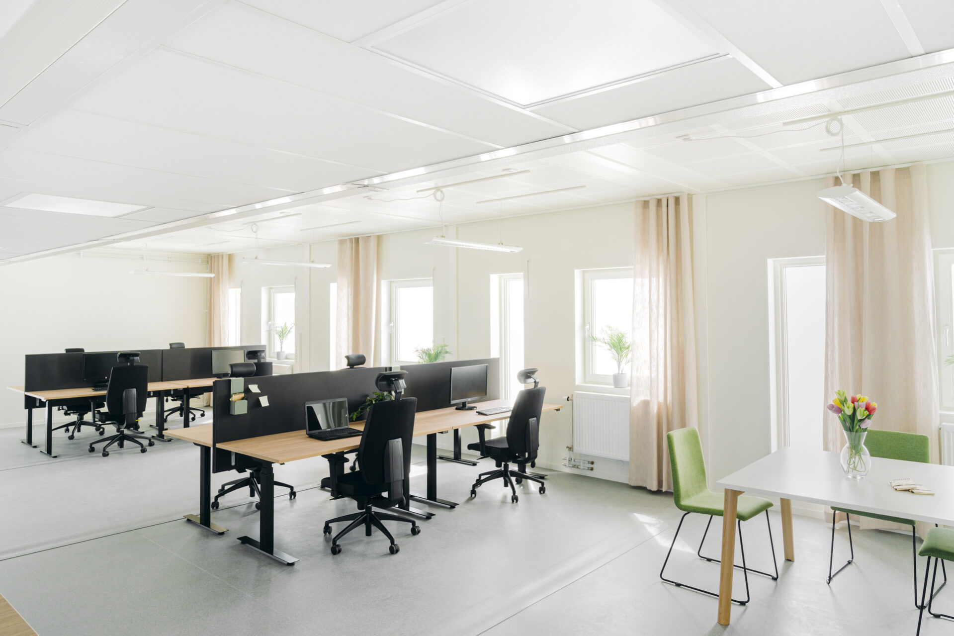 Toimistot ovat valoisia ja ilmavia, ja korkeilla käytävillä on suuria lasiosuuksia. Sisäkaton korkeus on 2,7 metriä, ja uusi ikkunayhdistelmä – pitkä kapea ikkuna leveämmän ikkunan vieressä – tarjoaa avaran näkymän ja paljon luonnonvaloa. Huoneissa on myös ääntä vaimentavat akustiikkalevyt viihtyisän ja rauhallisen työympäristön luomiseksi. Kylpyhuoneiden lattiat on päällystetty matoilla, jotka ovat osittain kierrätettyjä – myös Expandian omasta tuotannosta.