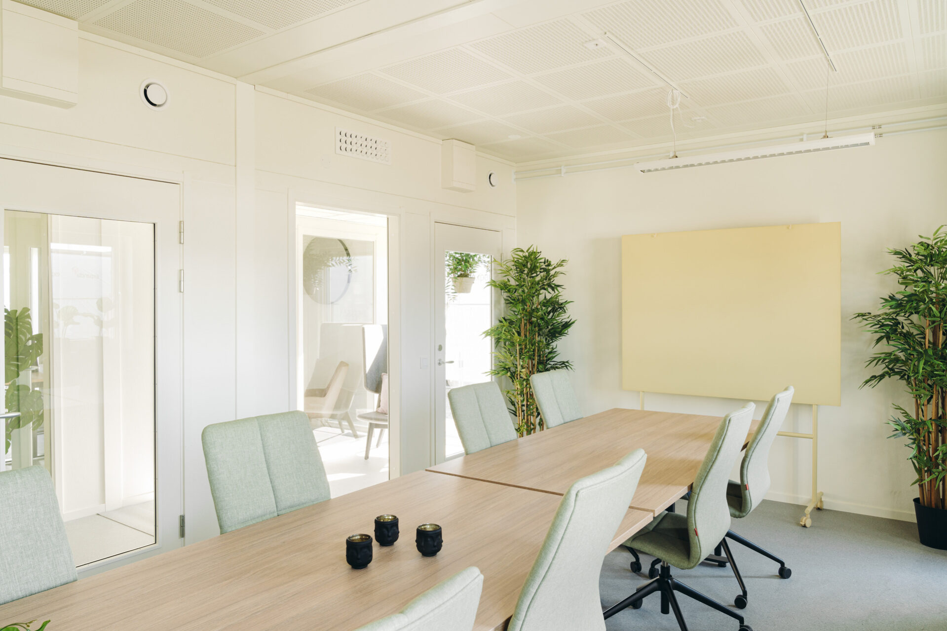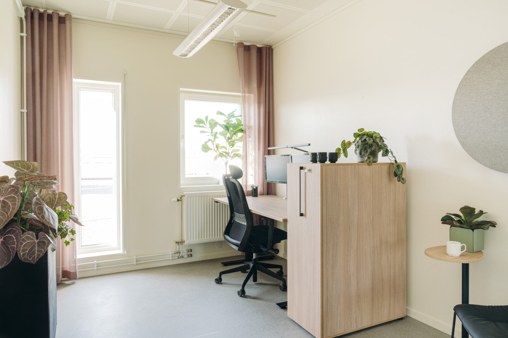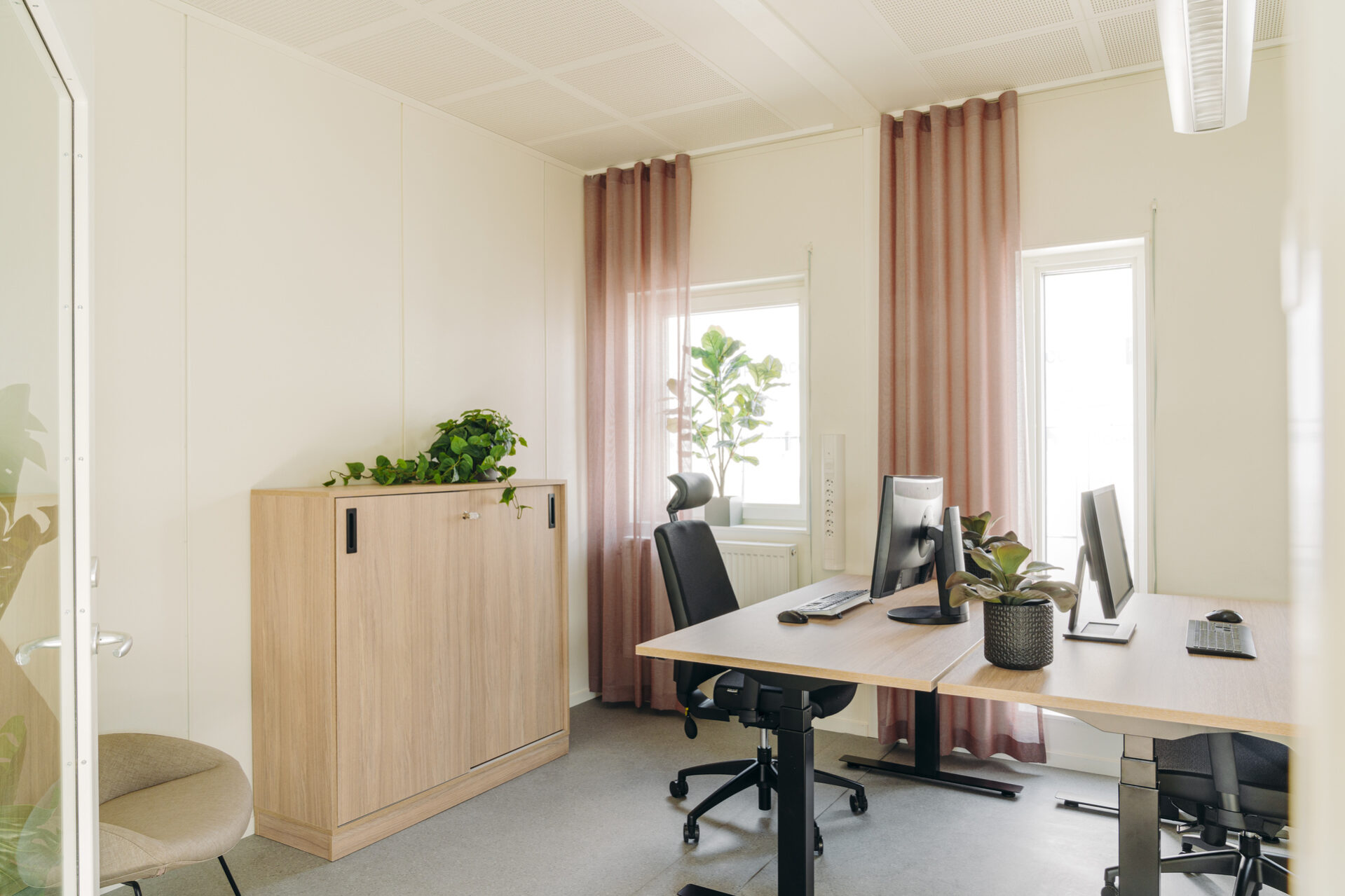 Toimistot ovat valoisia ja ilmavia, ja korkeilla käytävillä on suuria lasiosuuksia. Sisäkaton korkeus on 2,7 metriä, ja uusi ikkunayhdistelmä – pitkä kapea ikkuna leveämmän ikkunan vieressä – tarjoaa avaran näkymän ja paljon luonnonvaloa. Huoneissa on myös ääntä vaimentavat akustiikkalevyt viihtyisän ja rauhallisen työympäristön luomiseksi. Kylpyhuoneiden lattiat on päällystetty matoilla, jotka ovat osittain kierrätettyjä – myös Expandian omasta tuotannosta.