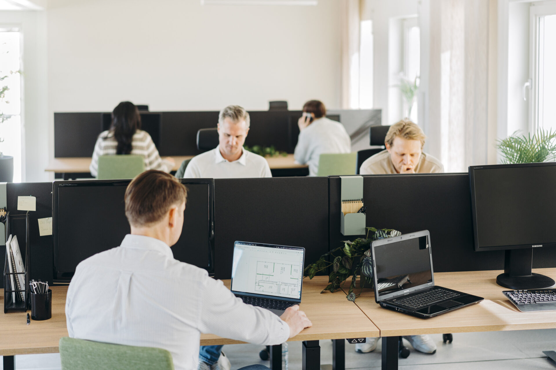 Itsekantavan rakenteen ansiosta voimme helposti luoda suuria avoimia tiloja. Ympäristö tuntuu aivan kuin pysyvältä, laadukkaalta toimistolta.”