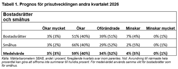 Trots att det är fler mäklare som tror på ett ökat ubud än ökad efterfrågan syns en stor ökning i andelen mäklare som tror på stigande bostadspriser (se tabell 1). Skillnaden mellan andelen mäklare som tror på stigande respektive fallande bostadspriser – nettotalet – under kvartal 2 är mycket större än motsvarande tal för kvartal 1 (se diagram 1). Nettotalet tangerar nästan den tidigare högsta nivån. 51 procent av mäklarna tror att skillnaden mellan utgångspris och slutpris kommer att öka under andra kvartalet 2026 att jämföra med 34 procent inför föregående kvartal.