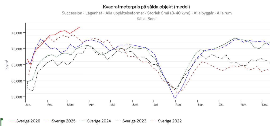 Under perioden 23 februari till 22 mars 2026 landade det genomsnittliga kvadratmeterslutpriset för lägenheter upp till 40 kvadratmeter, 1:or och 2:or, på 76 700 kronor. Det är en ökning av snittpriset med 8 procent jämfört med samma period förra året och den högsta noteringen sedan Booli började mäta. En liknande positiv priseffekt syns för mellanstora lägenheter upp till 80 kvadratmeter. För lägenheter över 80 kvadratmeter syns inte denna effekt. Där ligger snittpriset endast en procent över föregående år.