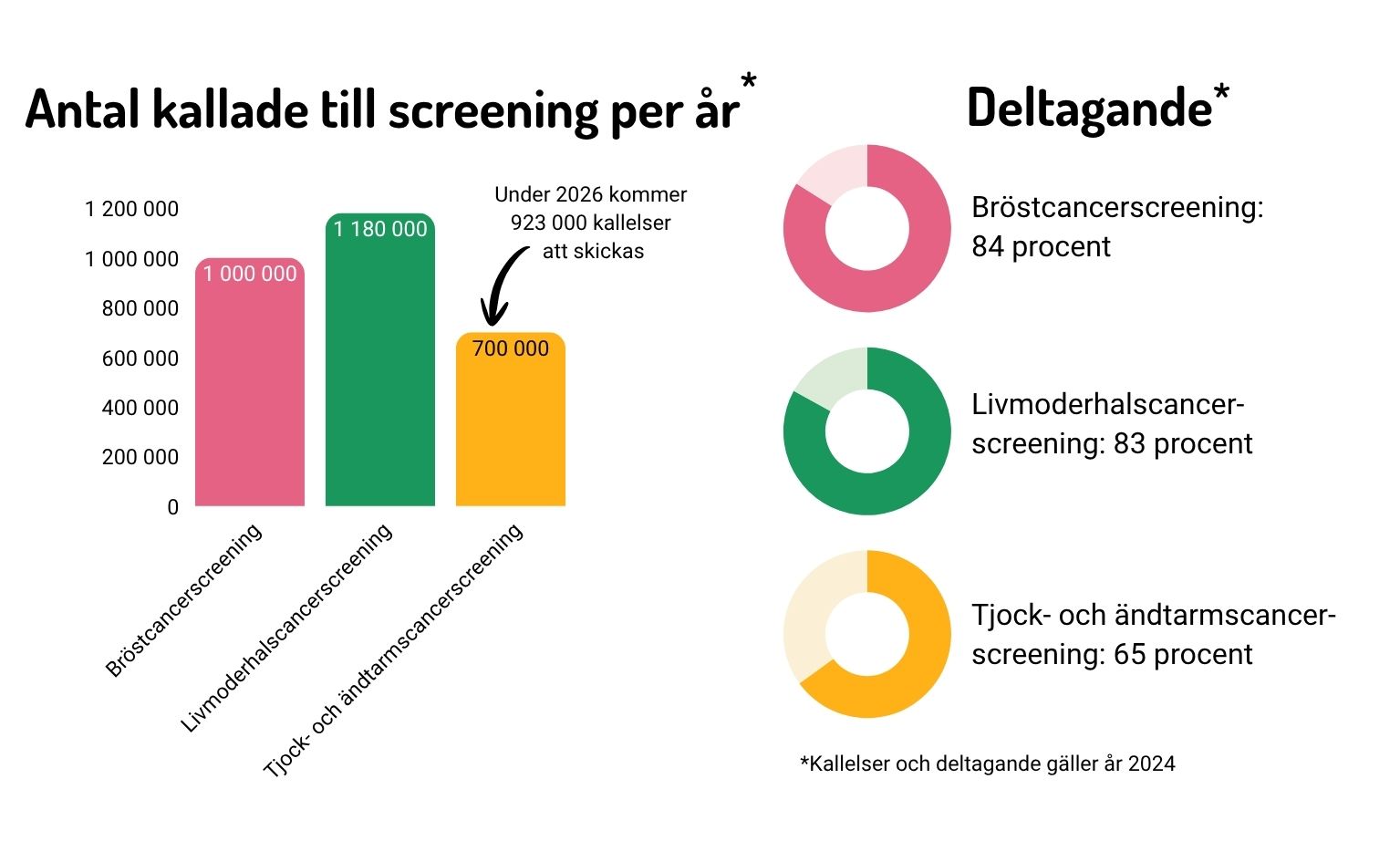 - Screeningprogrammen för bröstcancer och livmoderhalscancer bjuder årligen in mer än en miljon kvinnor vardera. Mer än 80 procent deltar.
