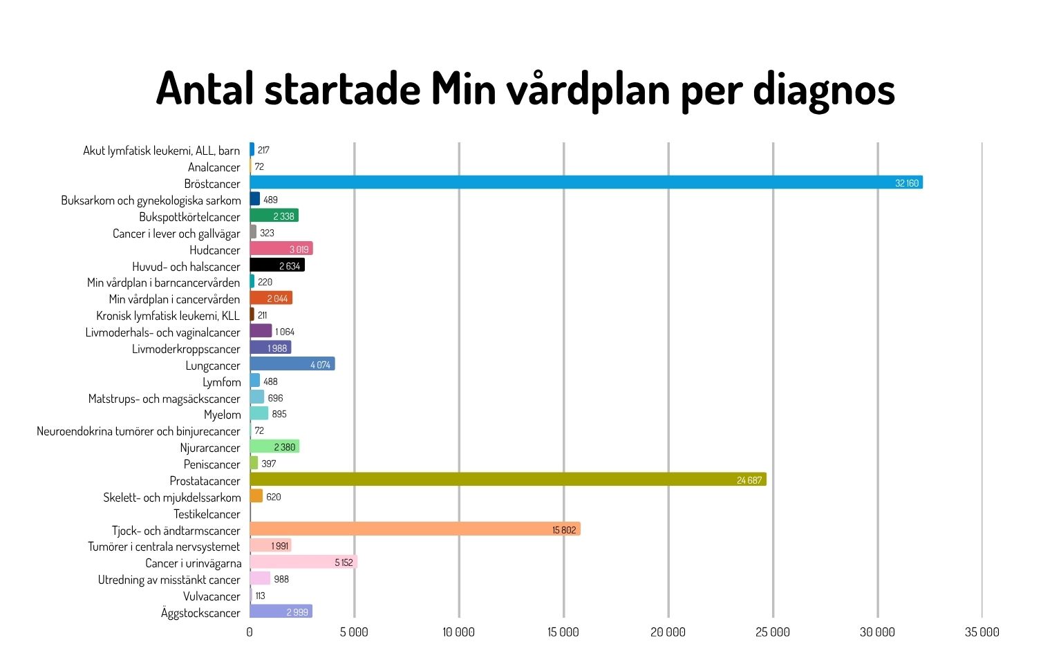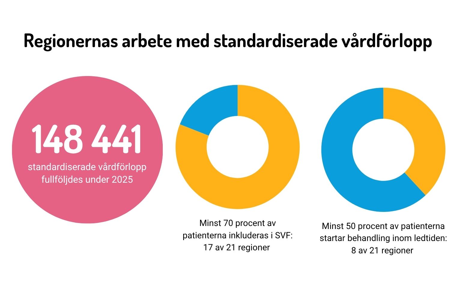 - Nästan 150 000 standardiserade vårdförlopp startades under 2025. Ungefär 30 procent av de utredda patienterna fick en cancerdiagnos.