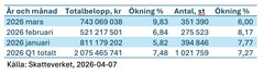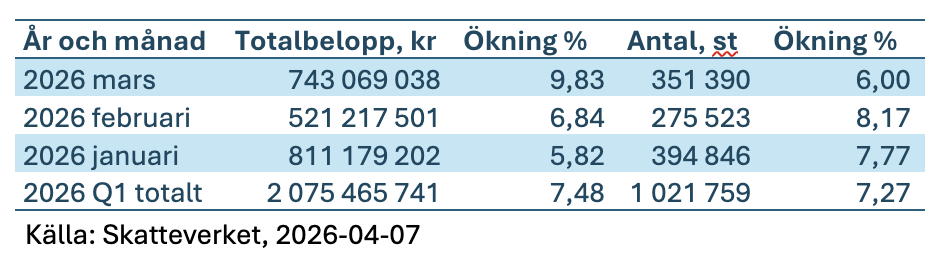 Sett till utvecklingen under kvartalet framträder en relativt jämn bild. Januari stod för det högsta totalbeloppet, drygt 811 miljoner kronor, följt av mars med cirka 743 miljoner kronor.