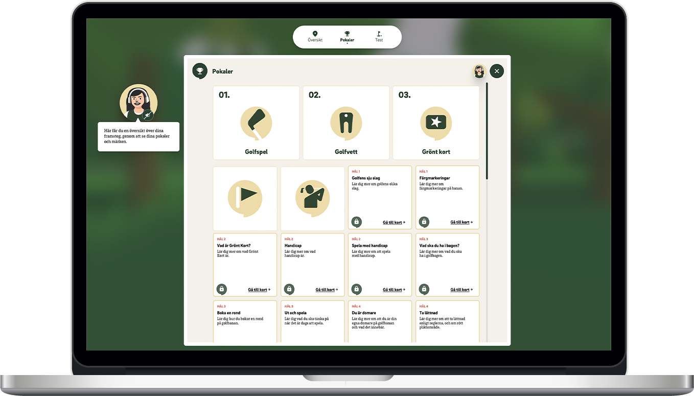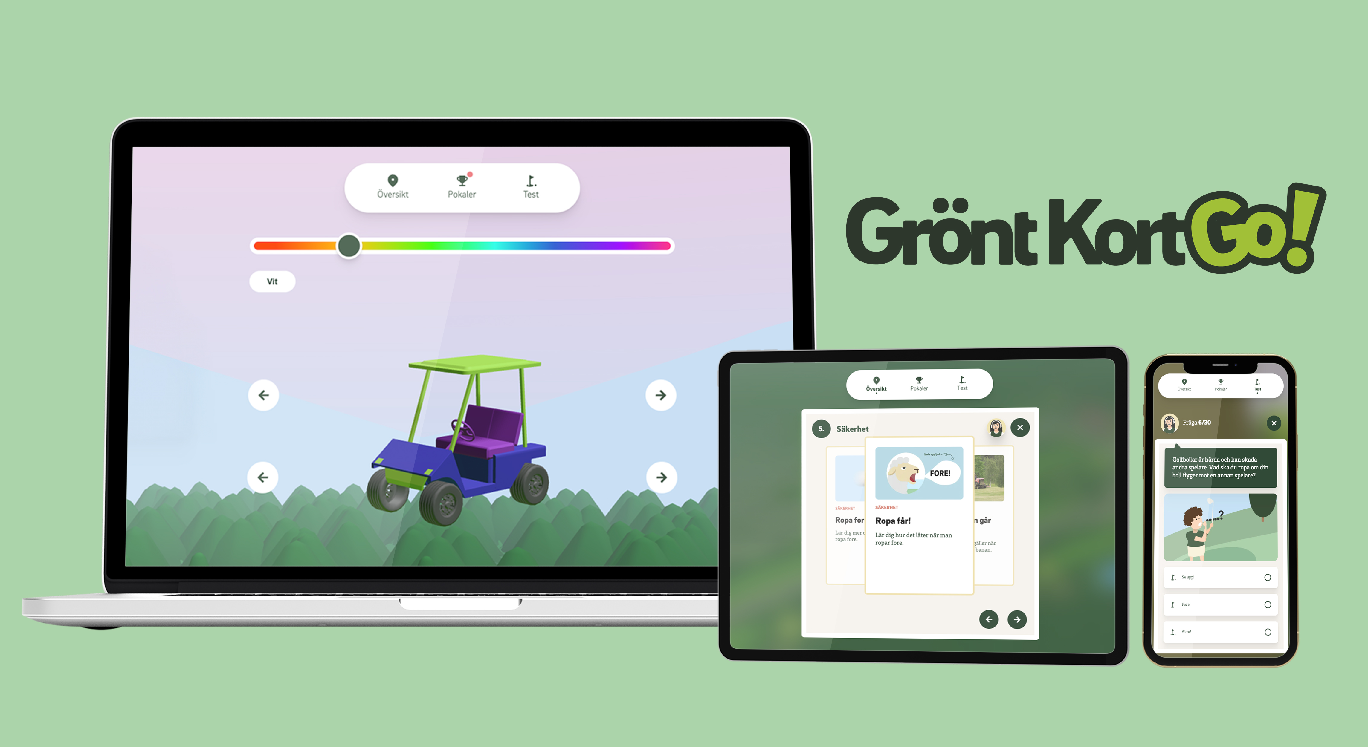 I webbaserade GröntKortGo! får barnen – via mobil, surfplatta eller dator – chans att träna på allt från regler till hur du agerar schysst och säkert på golfbanan. Med hjälp av många barns favorit, golfbilen, får de köra runt fritt på en virtuell golfbana och samla på sig kunskaper.