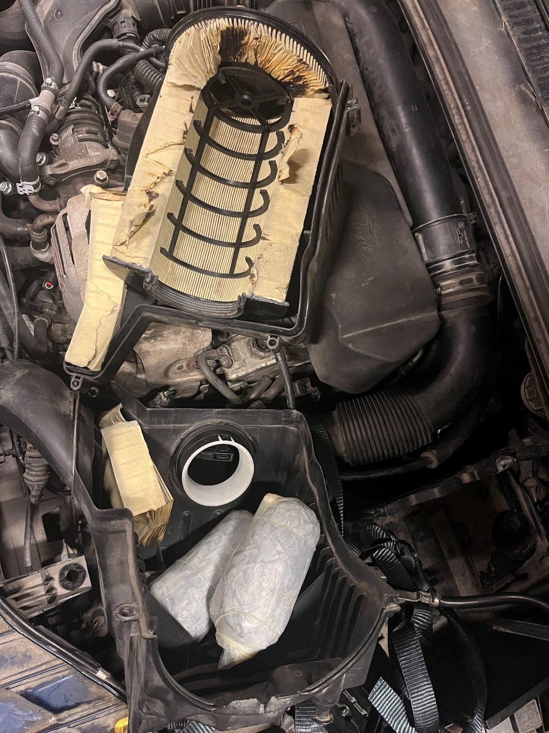 Tullinspektören la märke till ett begagnat bilbatteri på golvet bakom förarsätet och öppnar därför motorhuven för att kontrollera om batteriet var utbytt. Tullinspektören kunde se att batteriet i motorrummet var i dåligt skick och påtagligt manipulerat. Det fanns sprickor i batteriet och motorutrymmet hade byggts om så att det manipulerade batteriet skulle få plats. Väl gömt inuti batteriet upptäcktes 995,5 gram metamfetamin. Tullinspektören la också märke till att den ena luftburken i motorrummet satt löst och var ovanligt ren. I luftburken upptäcktes 599,4 gram opium.