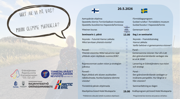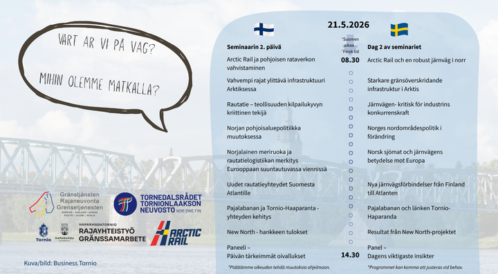 Tornio Centrum för nordiskt samarbetes öppningsseminarium "Vart är vi på väg?" kommer att hållas den 20–21 maj 2026. Seminariet organiseras i samarbete med Tornedalsrådet, Gränstjänsten Sverige-Finland-Norge, TornioHaparanda-gränssamarbete och Arctic Rail Oy.