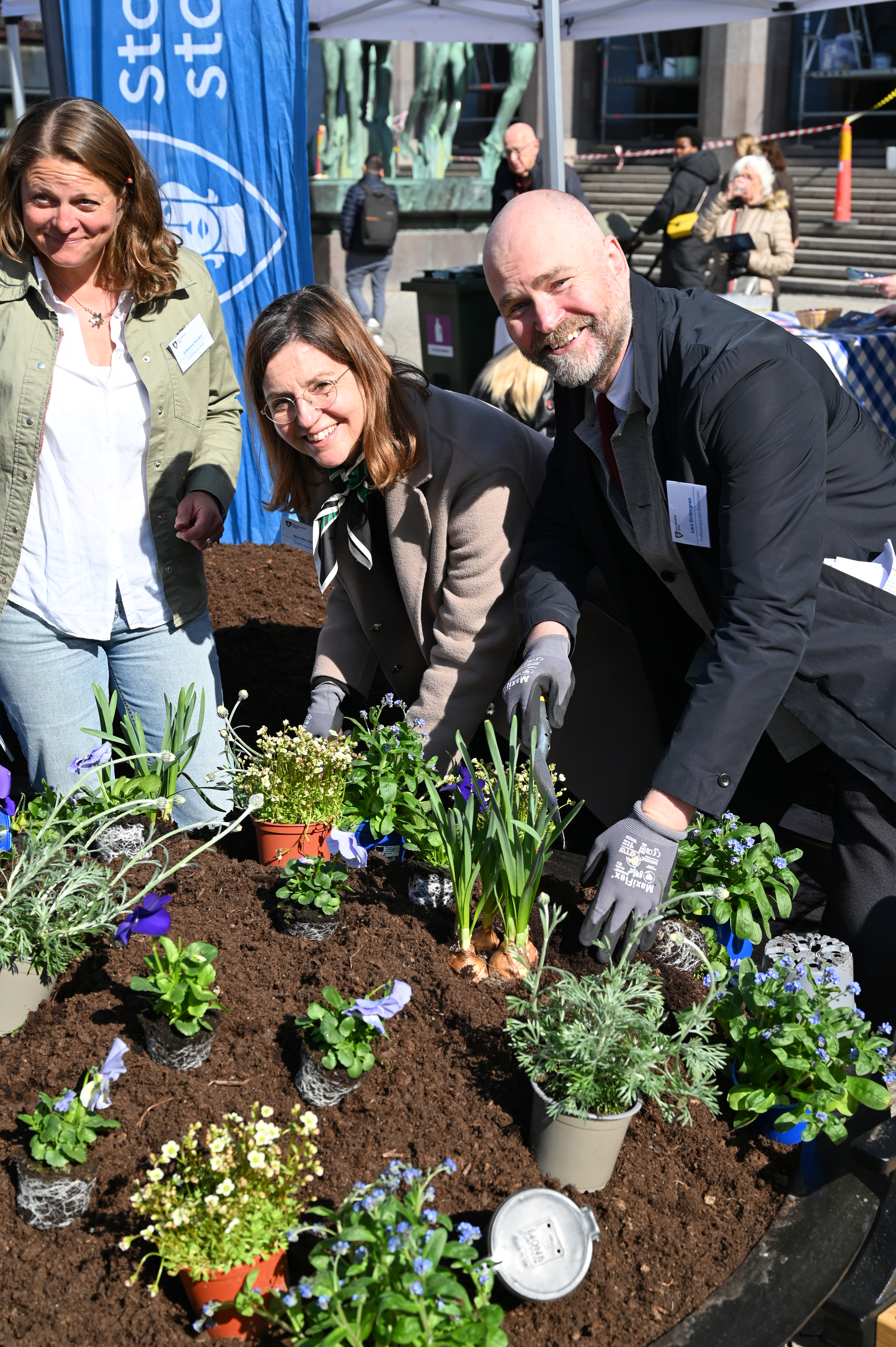 Johanna Karlén, trädgårdsingenjör och projektledare på trafikkontoret i Stockholms stad, trafikdirektör Gunilla Glantz och trafikborgarråd Lars Strömgren planterar blommor vid invigningen av årets blomsterprogram. Foto: Sam Victorin