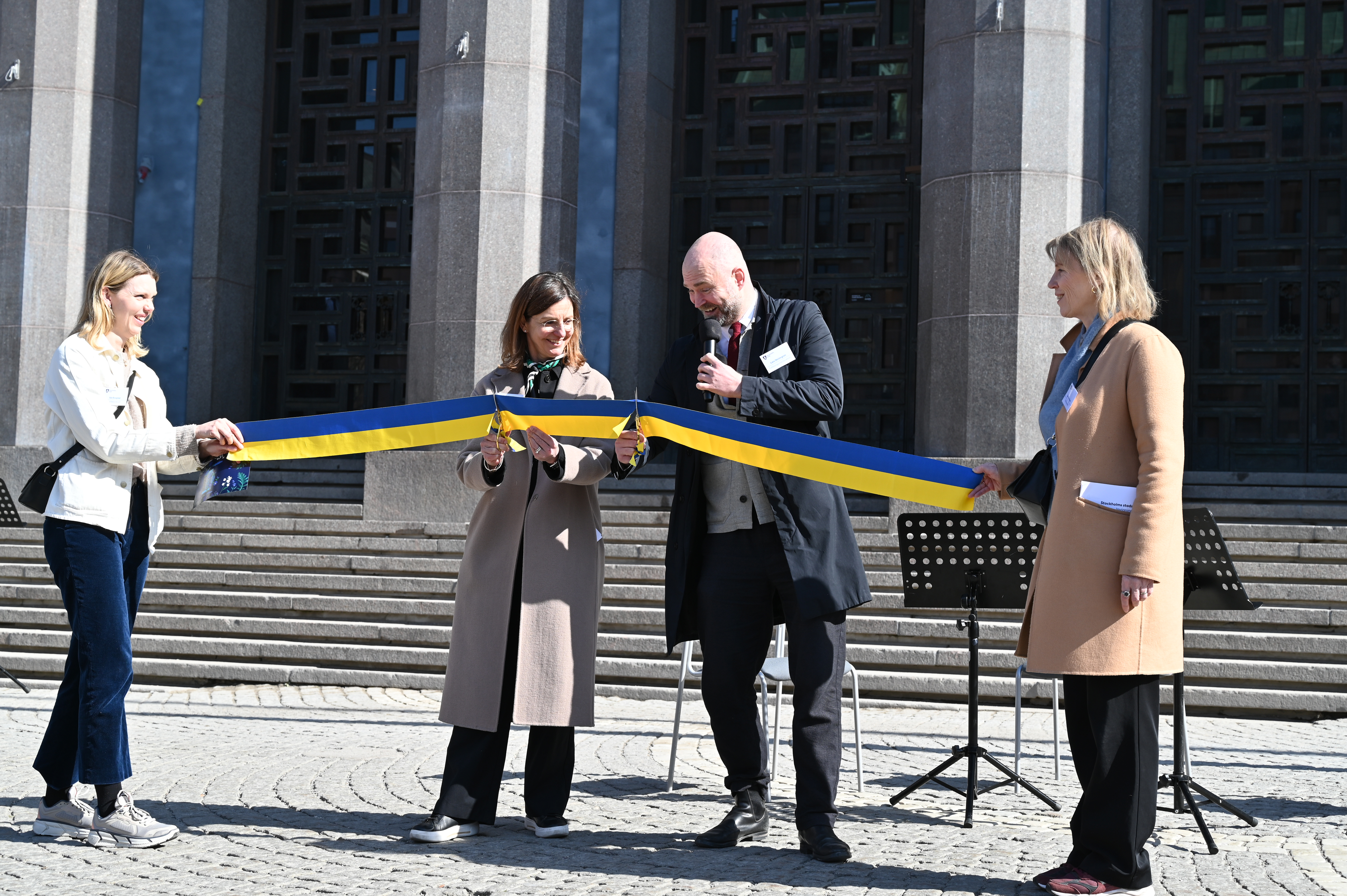 Två personer klipper ett blågult band.