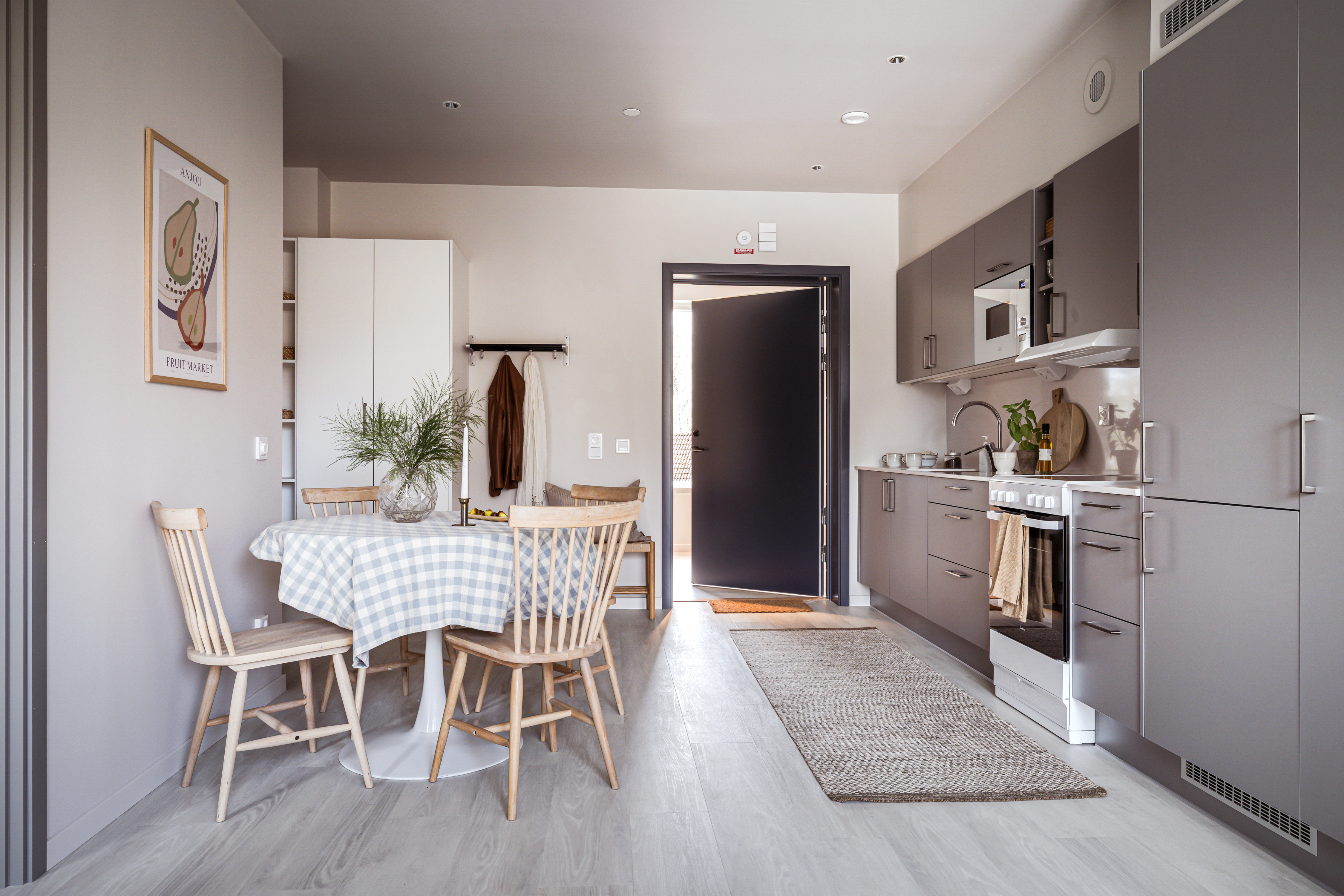 Boendet är uppfört i två plan och rymmer sex lägenheter – två på bottenvåningen och fyra på övre plan. I entréplan finns även gemensamma ytor som kök och vardagsrum samt personalutrymmen. Samtliga lägenheter har antingen egen uteplats eller fransk balkong och är utrustade med kombimaskin.